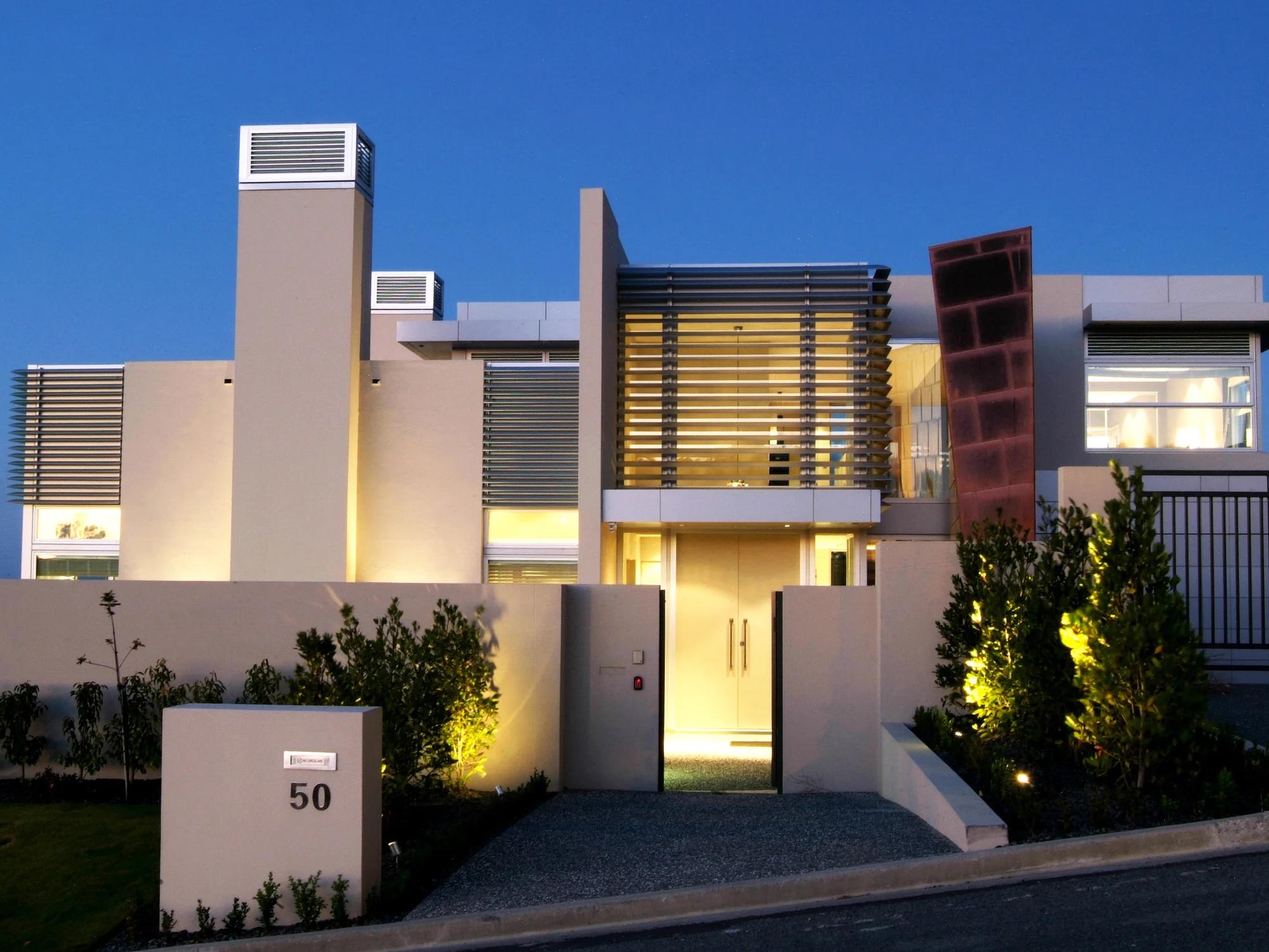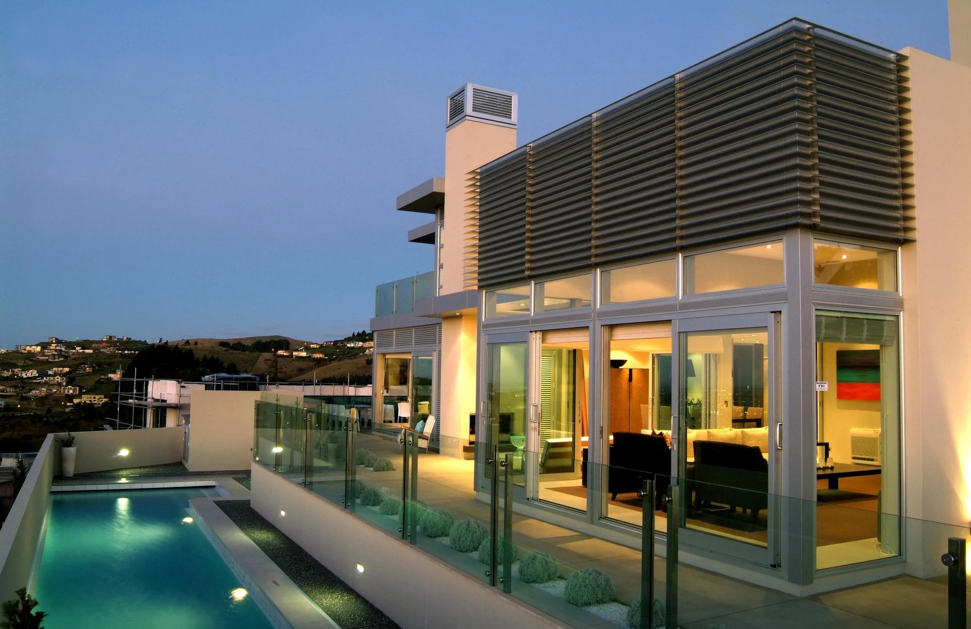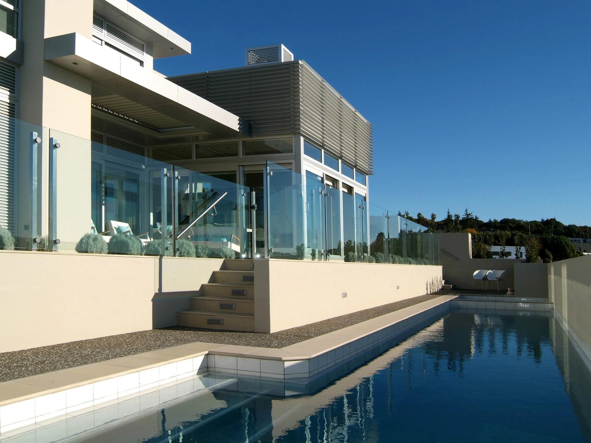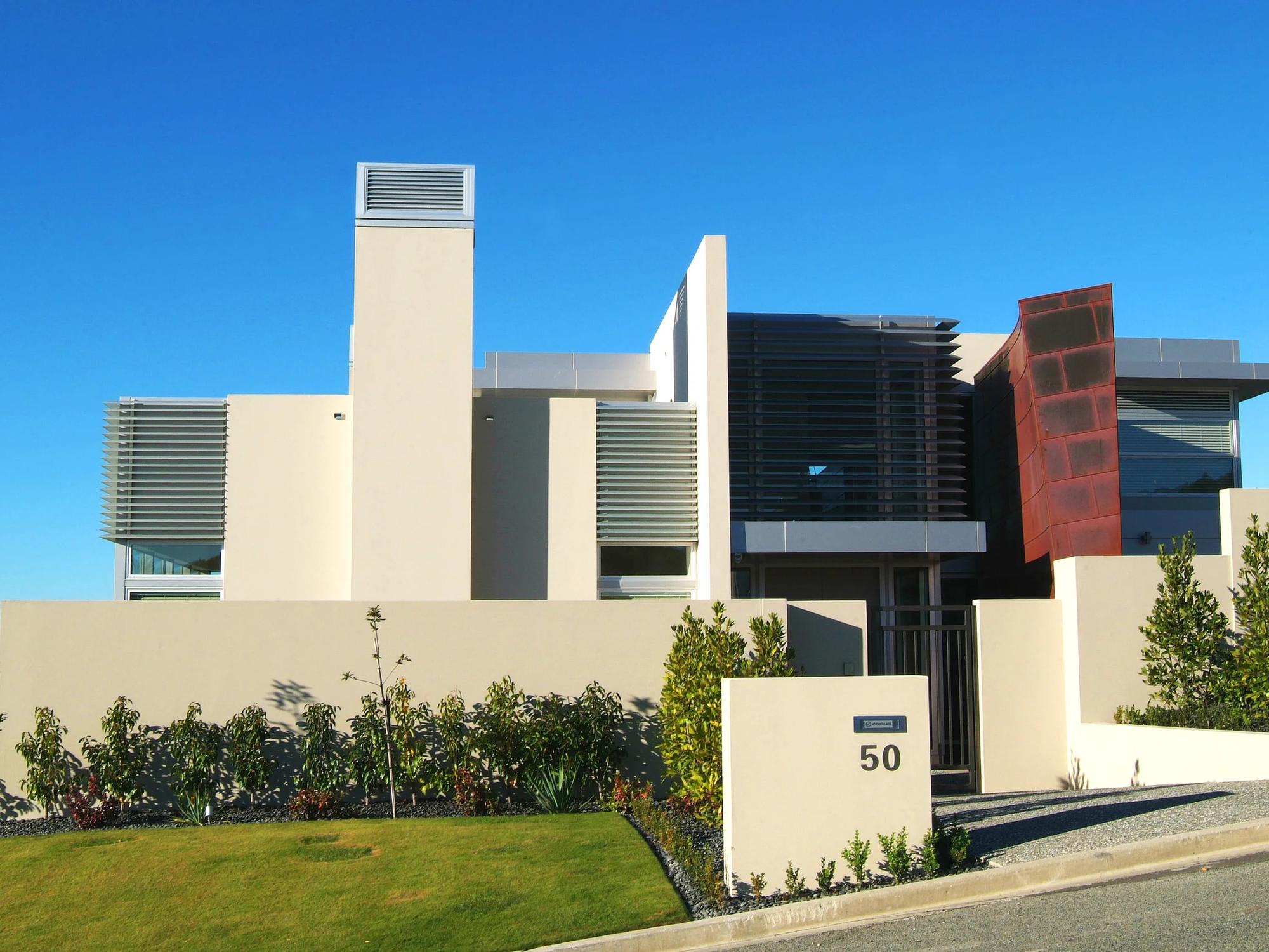 At the heart of the house, a central east–west spine wall and stair gallery anchors the composition, with all spaces stemming from this organising element. Clad in large-format polished porcelain tile panels, the spine extends beyond the building envelope, terminating in sculptural copper walls and water features to the east and west. Externally, strong horizontal planes are balanced by defined vertical elements, with monolithic plaster walls, anodised silver joinery, glass balustrades and copper detailing combining to create a confident architectural presence on the hillside.