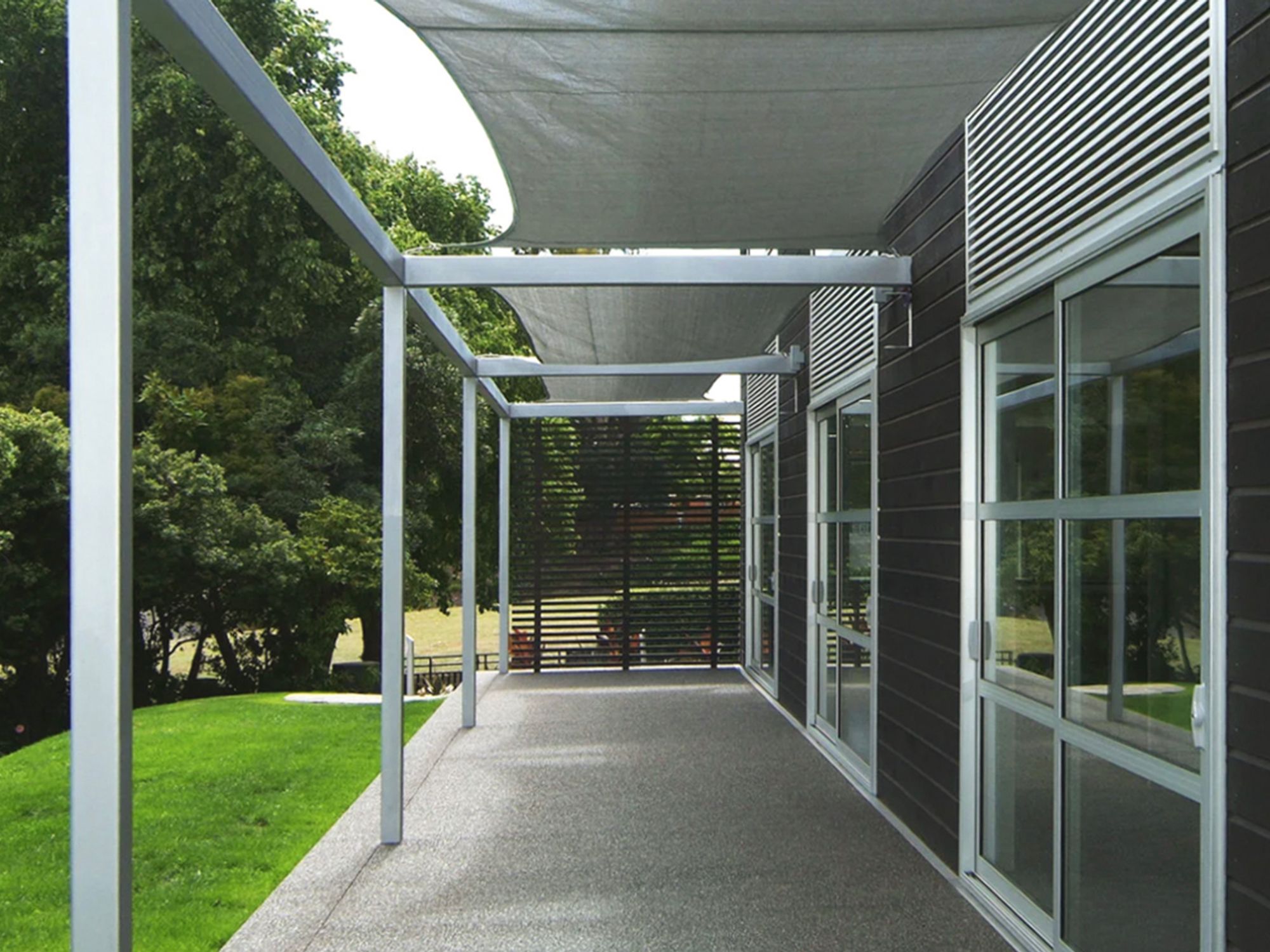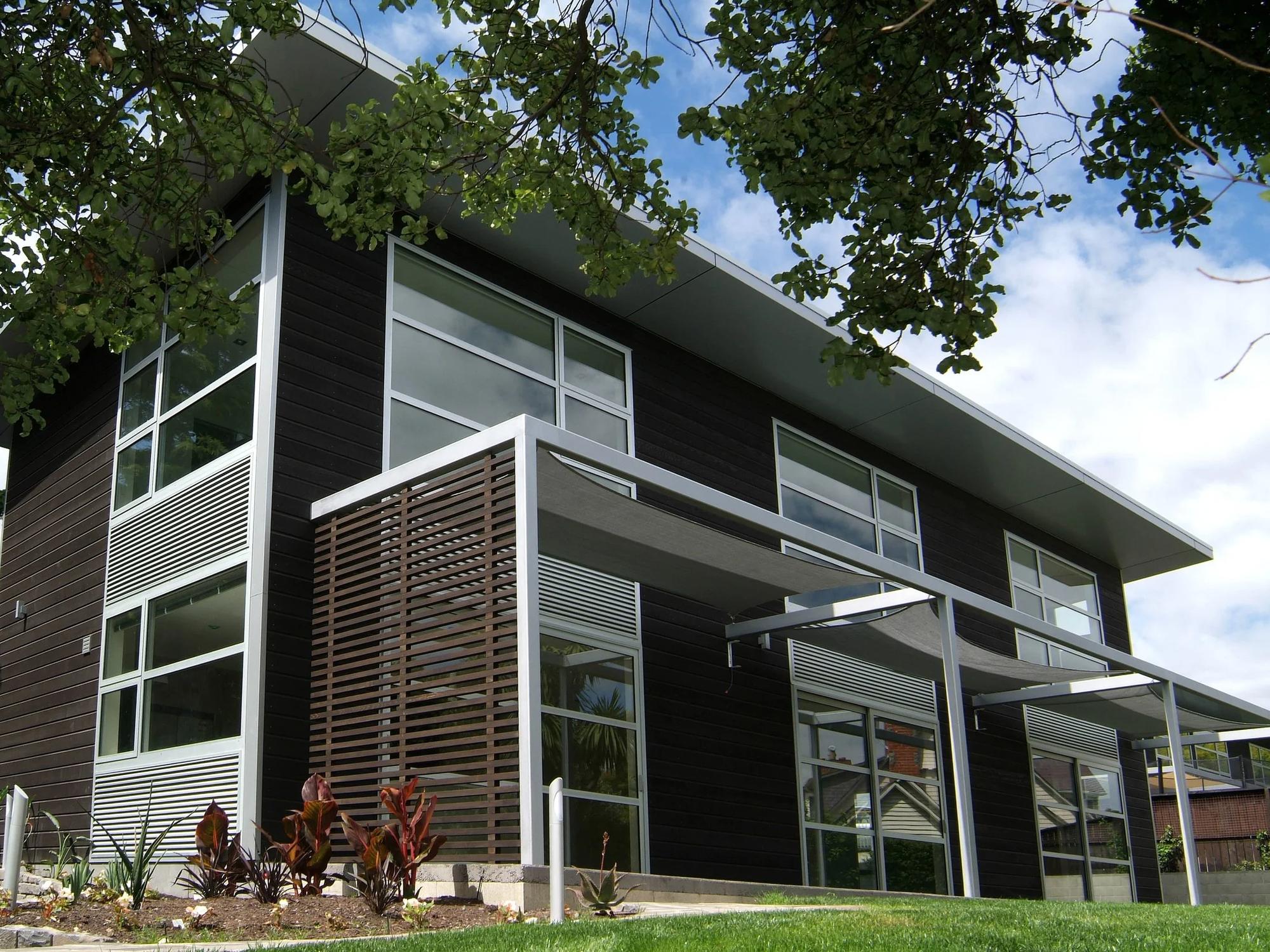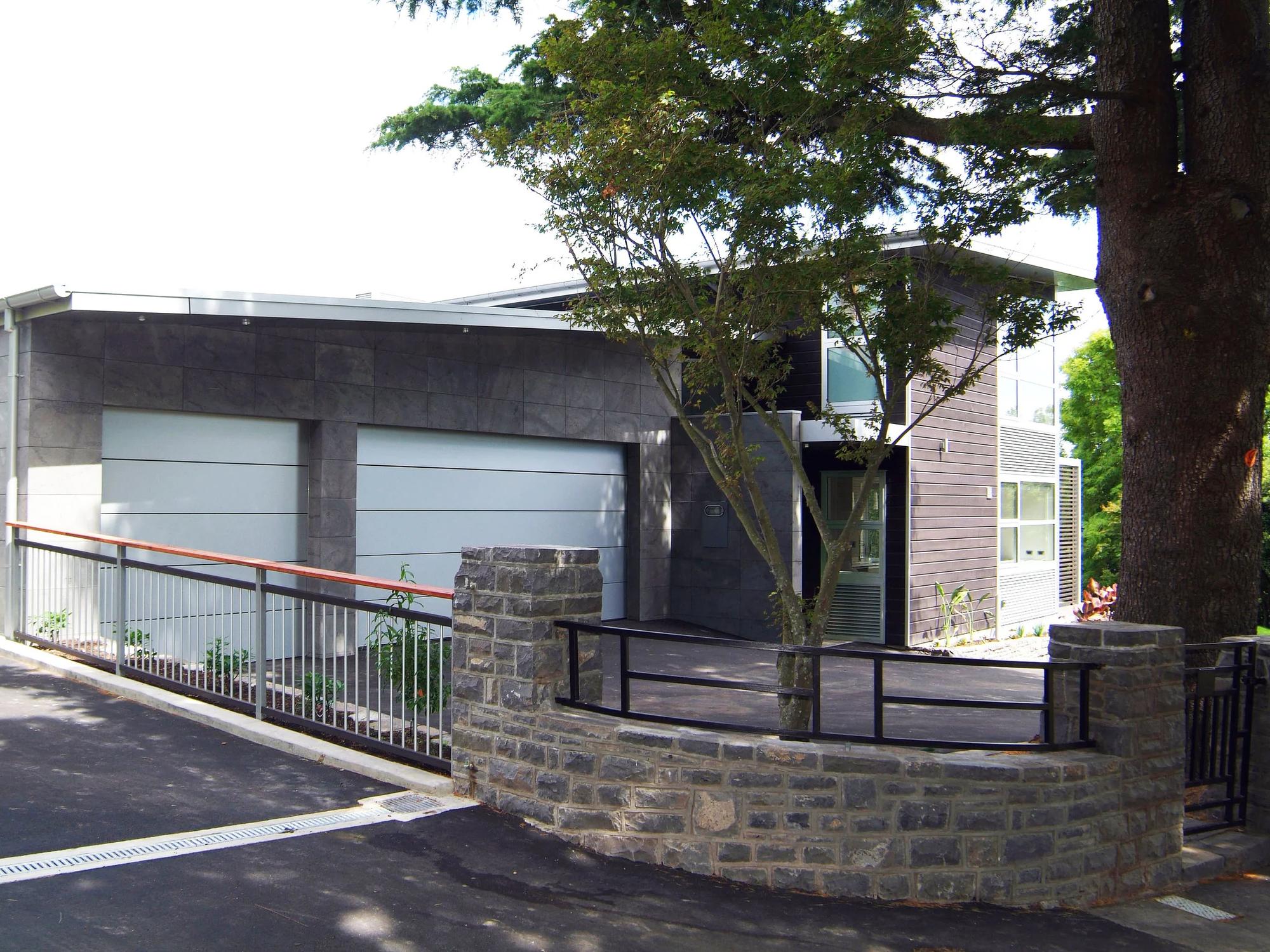 The architecture adopts clean, relaxed lines with a restrained material palette. Dark stained cedar cladding references the creosote finishes historically used in the area, paired with contemporary elements including anodised aluminium joinery and louvres, composite aluminium soffits, and exposed aggregate paving. Additional local stone was introduced into the landscape and garage walls, further strengthening the connection to the site’s heritage.