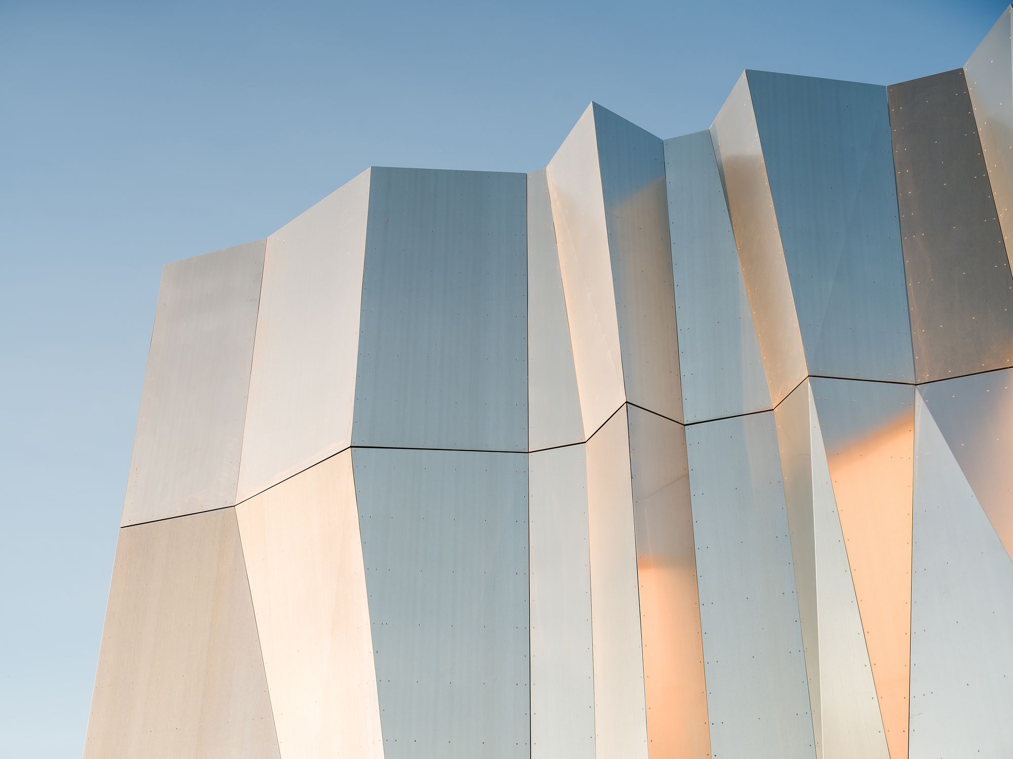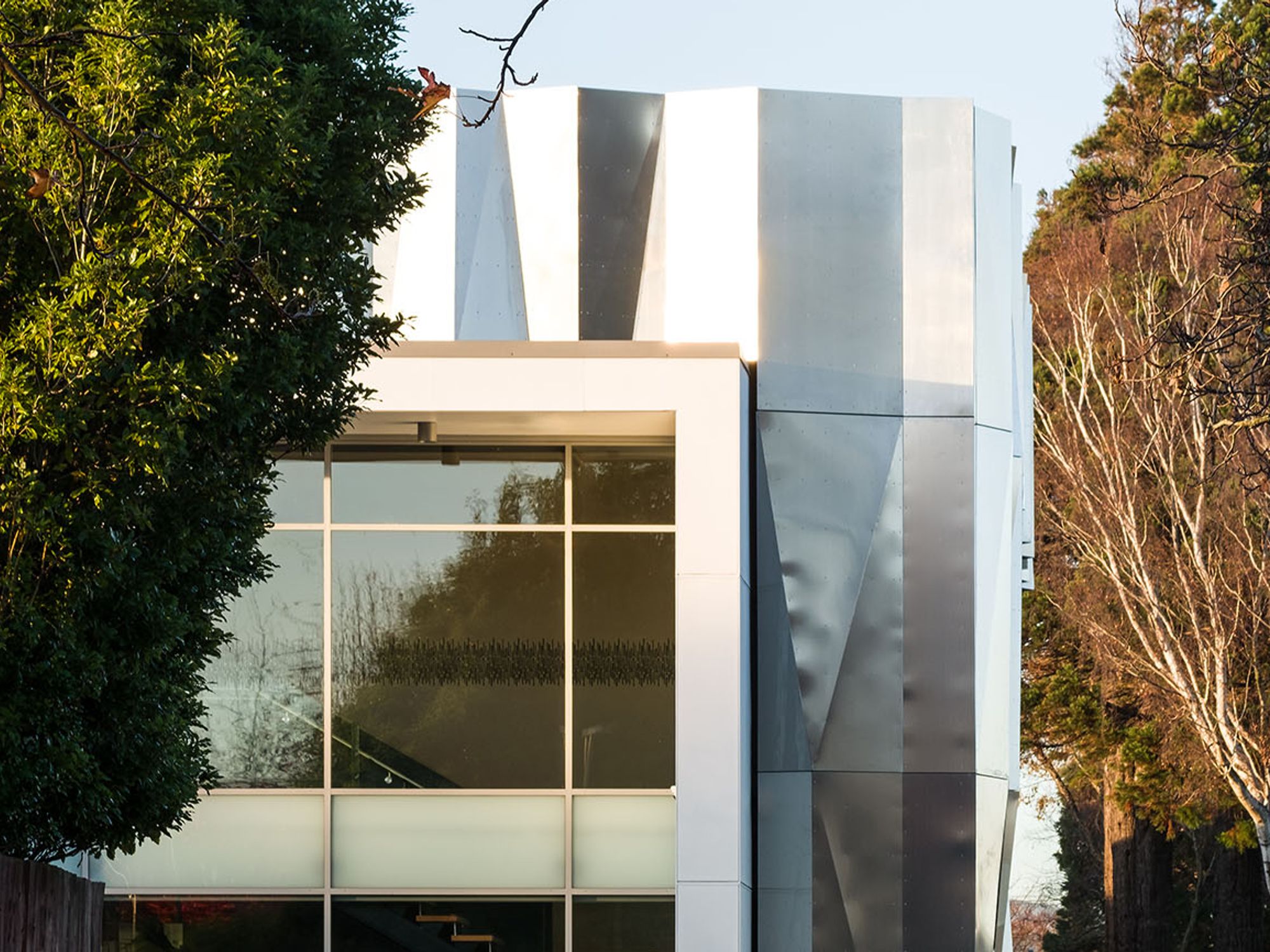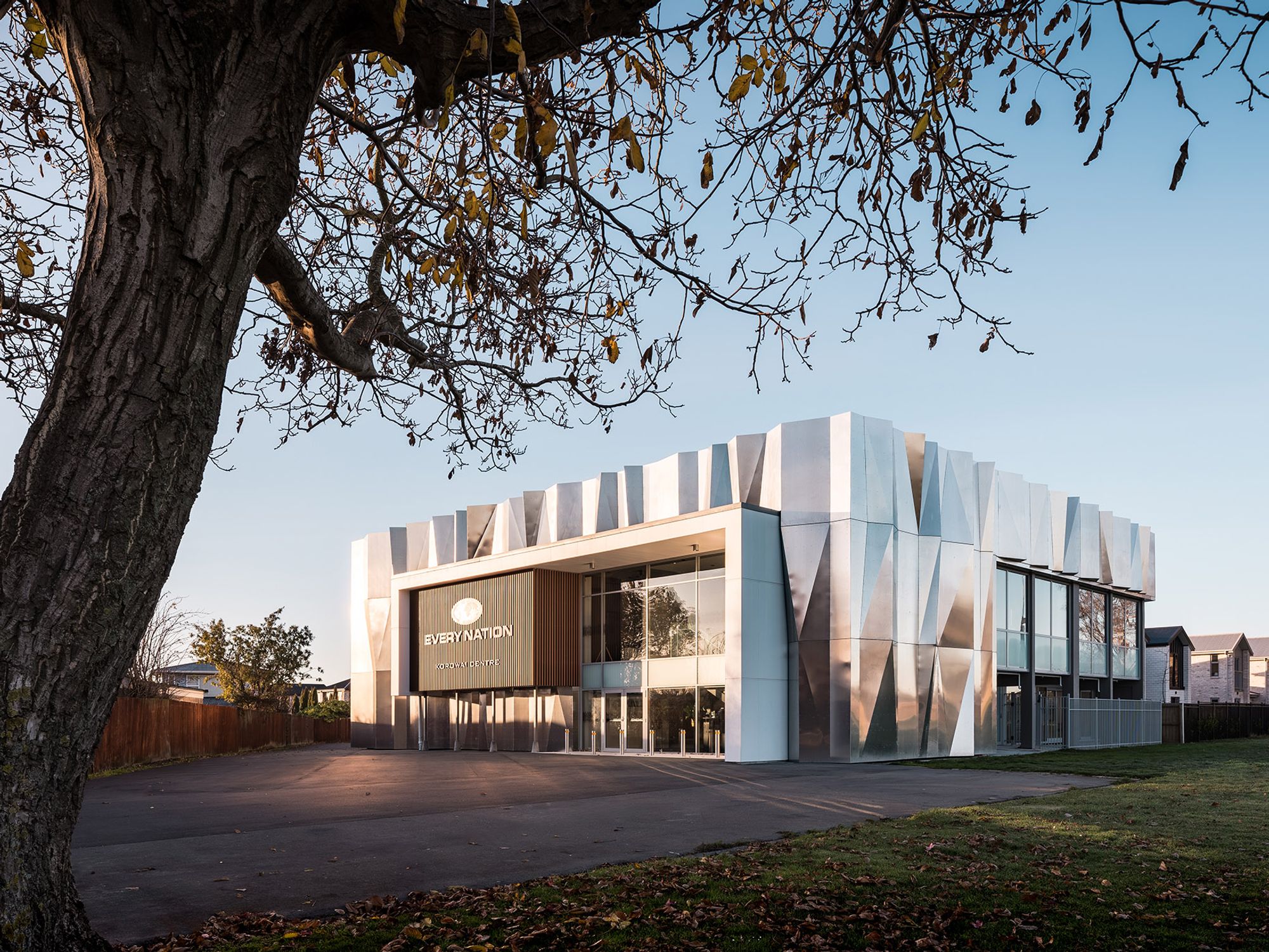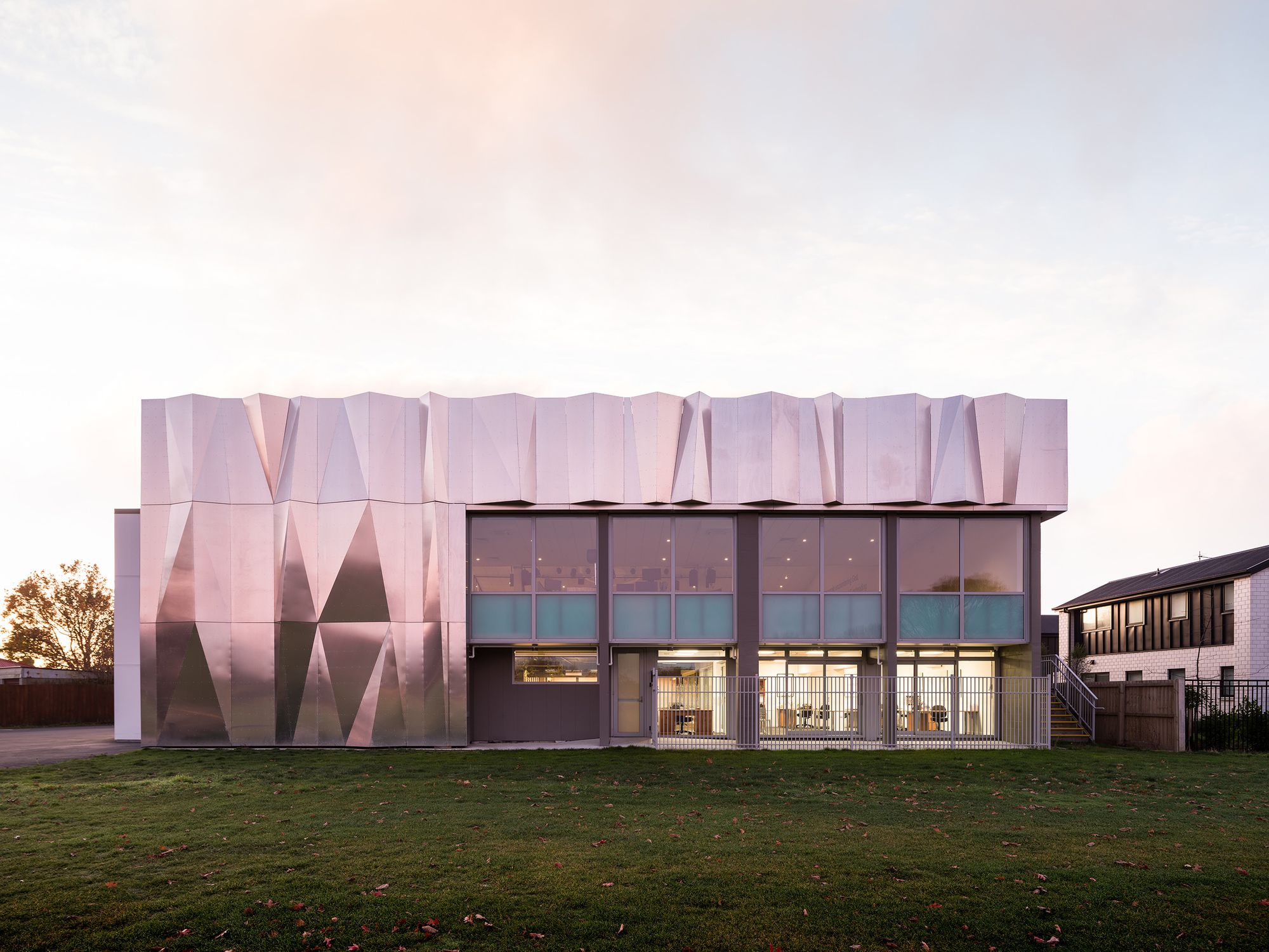 The refurbishment combined economical upgrades with precise architectural interventions. The exterior was refreshed with cost-effective cladding, while the north, west, and part of the south elevations were wrapped in a folded aluminium façade, developed in close collaboration with structural engineers (Beca) and metalwork specialists (Metalwork & Design). Inside, low first-floor ceilings over the auditorium were replaced with a new roof and full-height glazing, filling the space with light and park views. On the ground floor, redundant block walls were removed to create an open foyer, kitchen, and office area.
