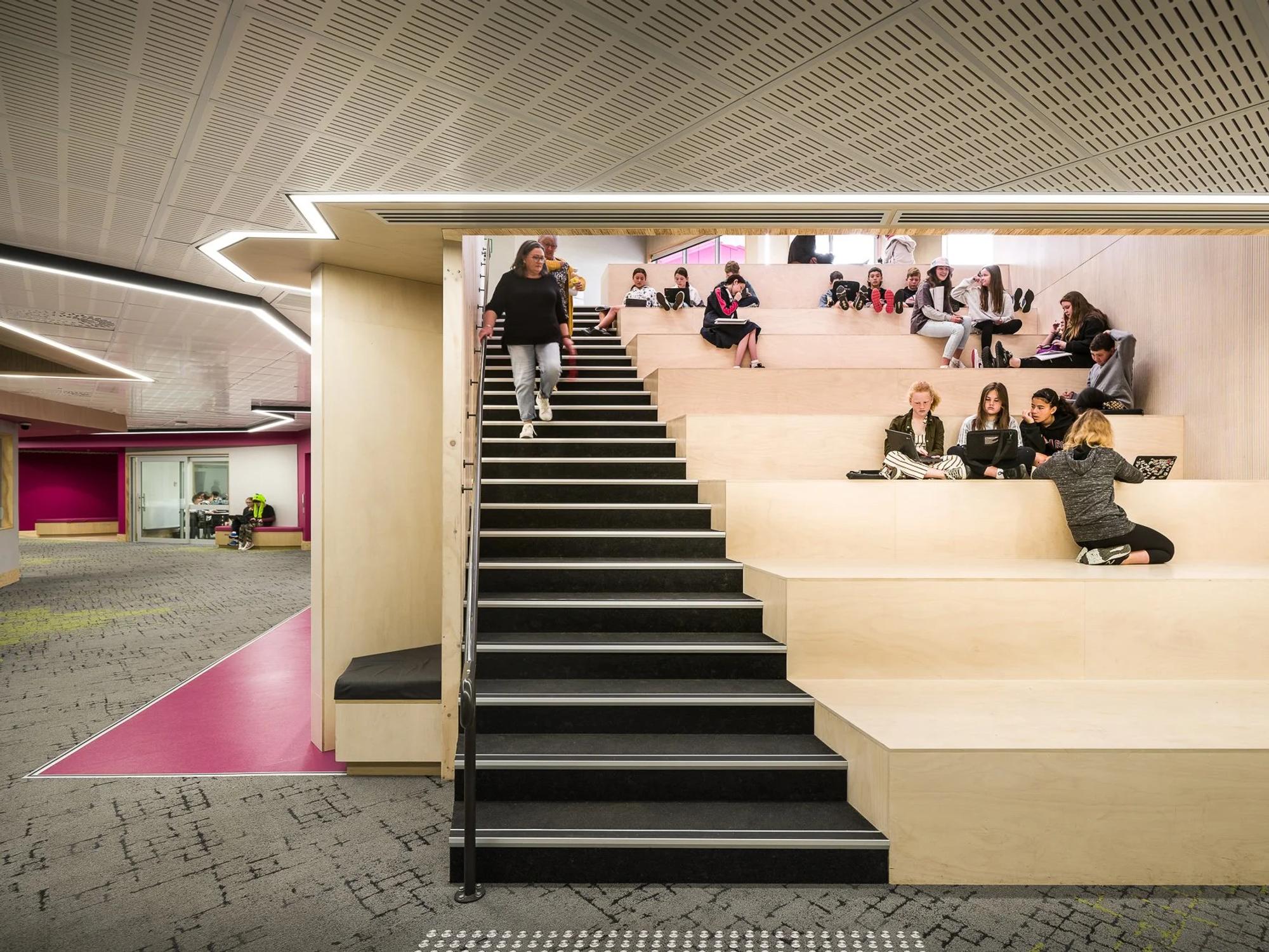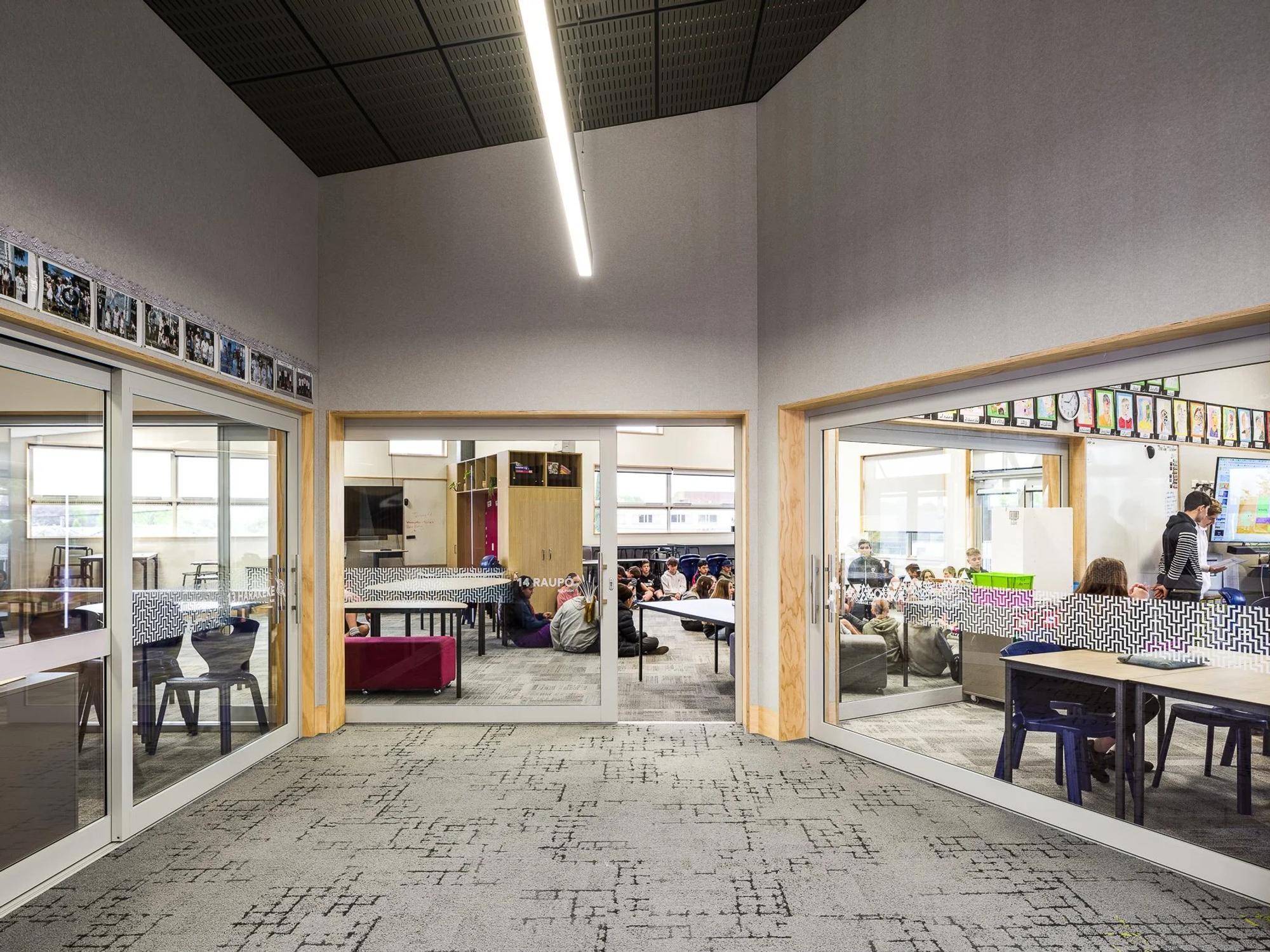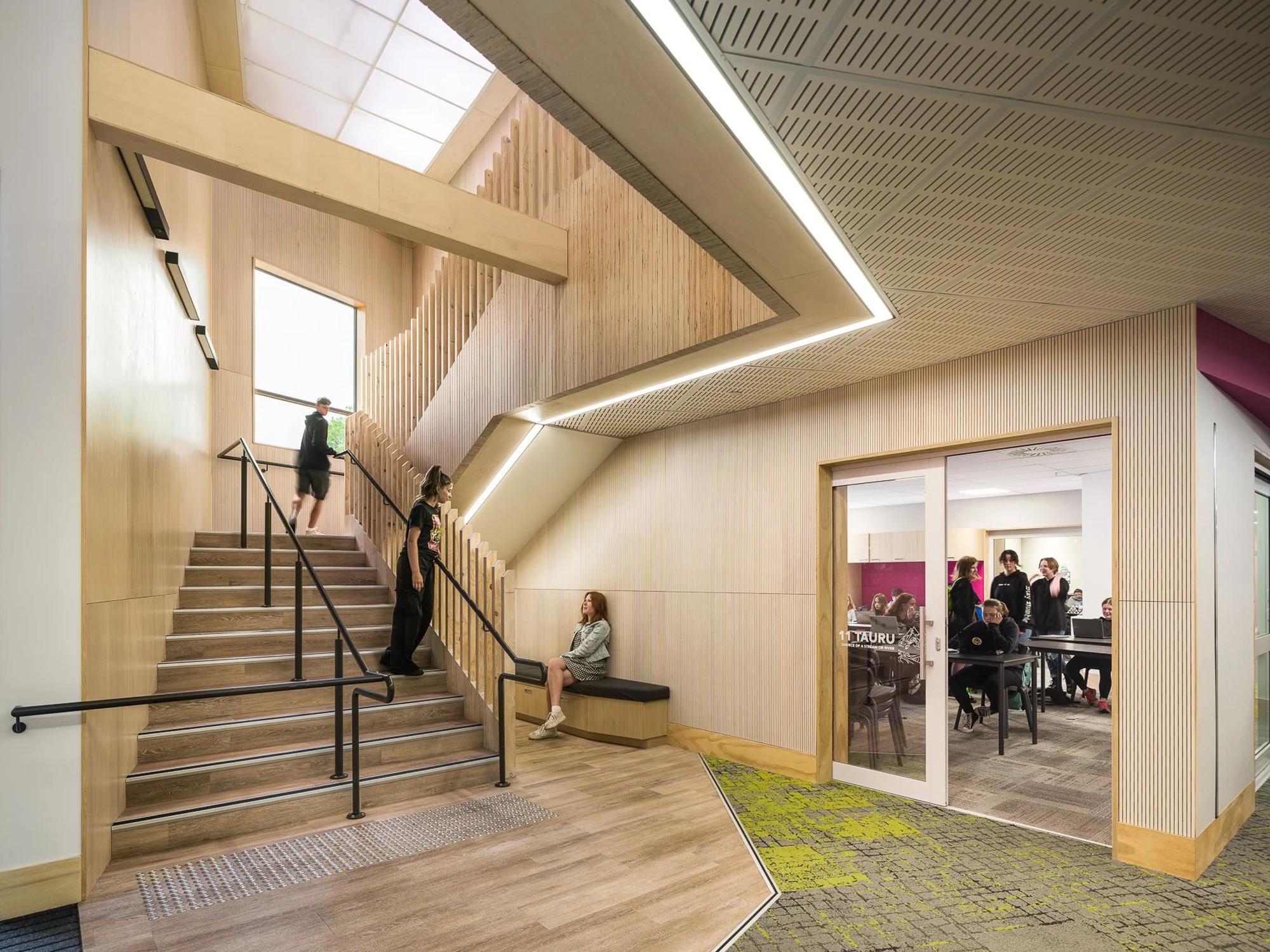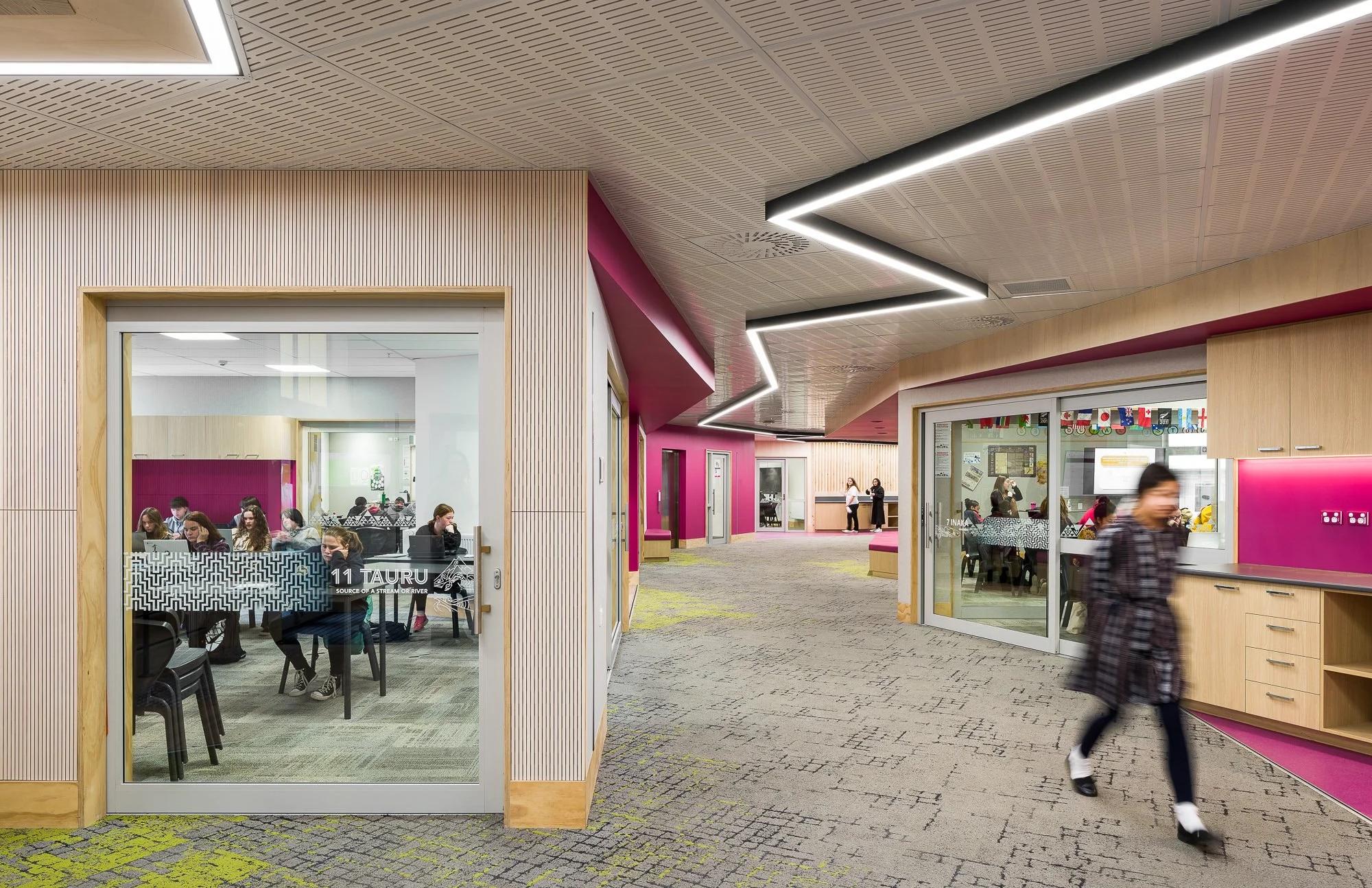 The masterplan combines upgrades to existing buildings with the construction of a new purpose-built Middle School comprising 22 general learning spaces. The design process was highly collaborative, involving administration, teachers, parents, and students to ensure that growth does not compromise the school’s caring and inclusive culture. The Middle School incorporates spaces for Ko Taku Reo (Deaf Education) and visually impaired students, featuring integrated visual warning systems and flexible spaces that allow participation alongside Hillmorton High students. A new landscaped pedestrian boulevard will connect the Middle School to the Upland block, a Special Needs Unit, further reinforcing inclusivity and connectivity across the campus.