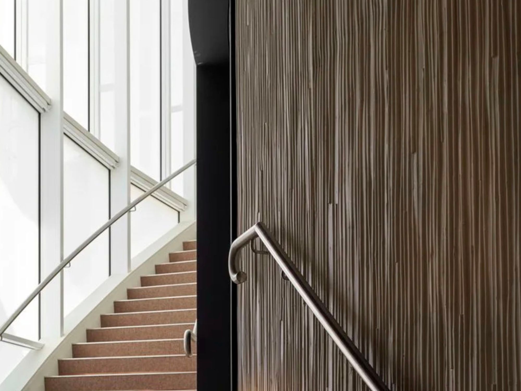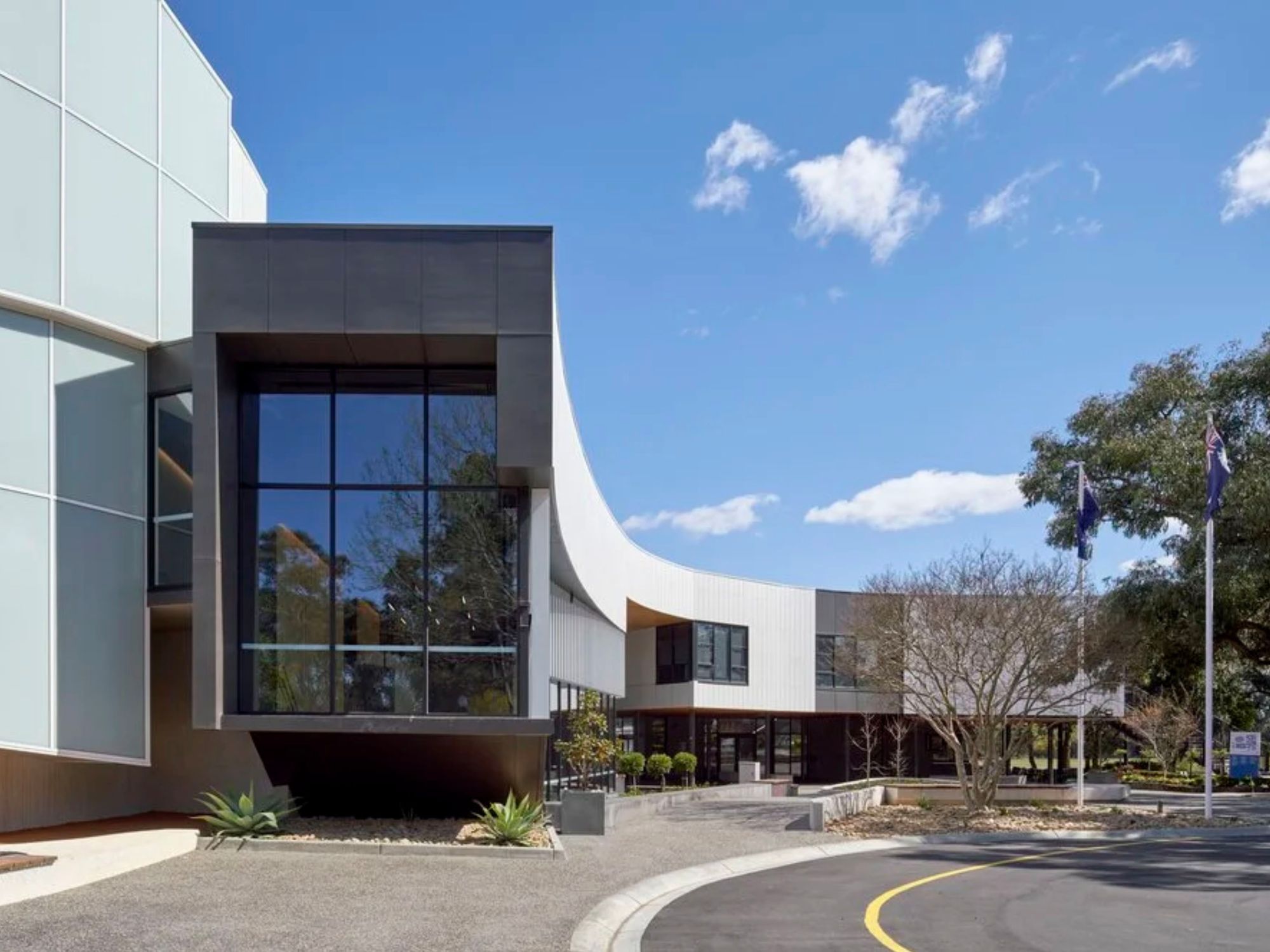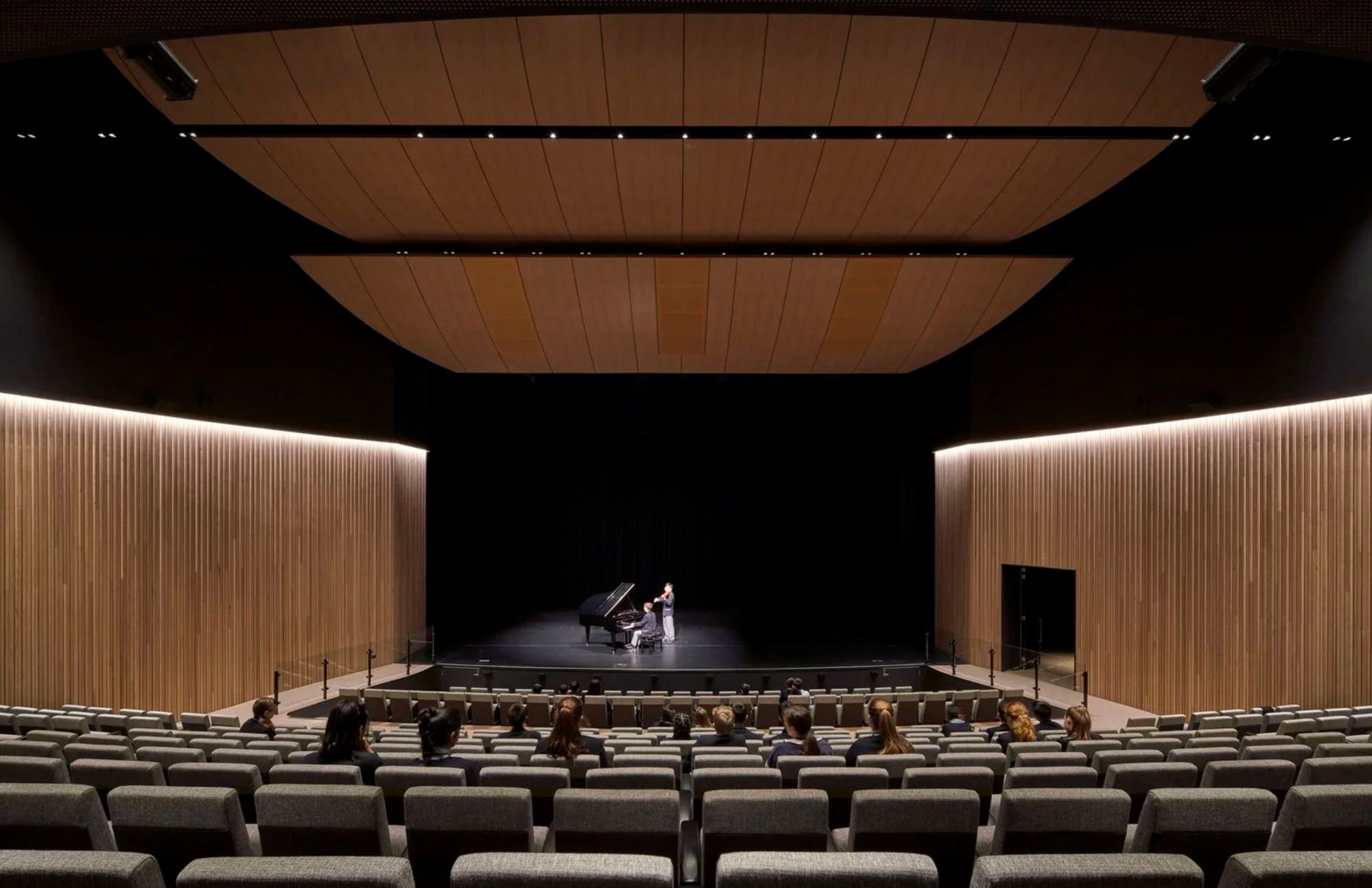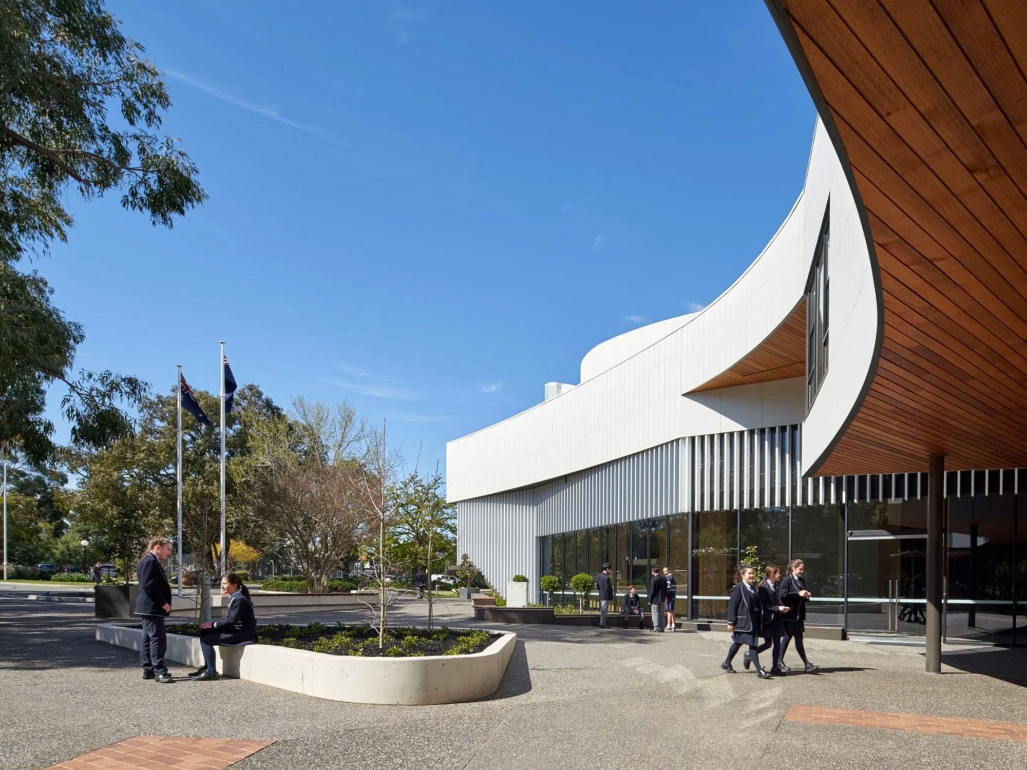 The two-tiered auditorium is supported by a full suite of associated facilities, including wings, loading dock, green room, changing areas, foyers and direct links to the existing drama and VCE centre. The curved form of the building defines its architectural character, expressed through a precast feature façade, faceted full-height glazing and cantilevered staircases. Internally, timber feature walls and carefully integrated lighting create warmth and focus, while an elevated lecture stand and flexible performance platforms allow the space to adapt to a range of uses.