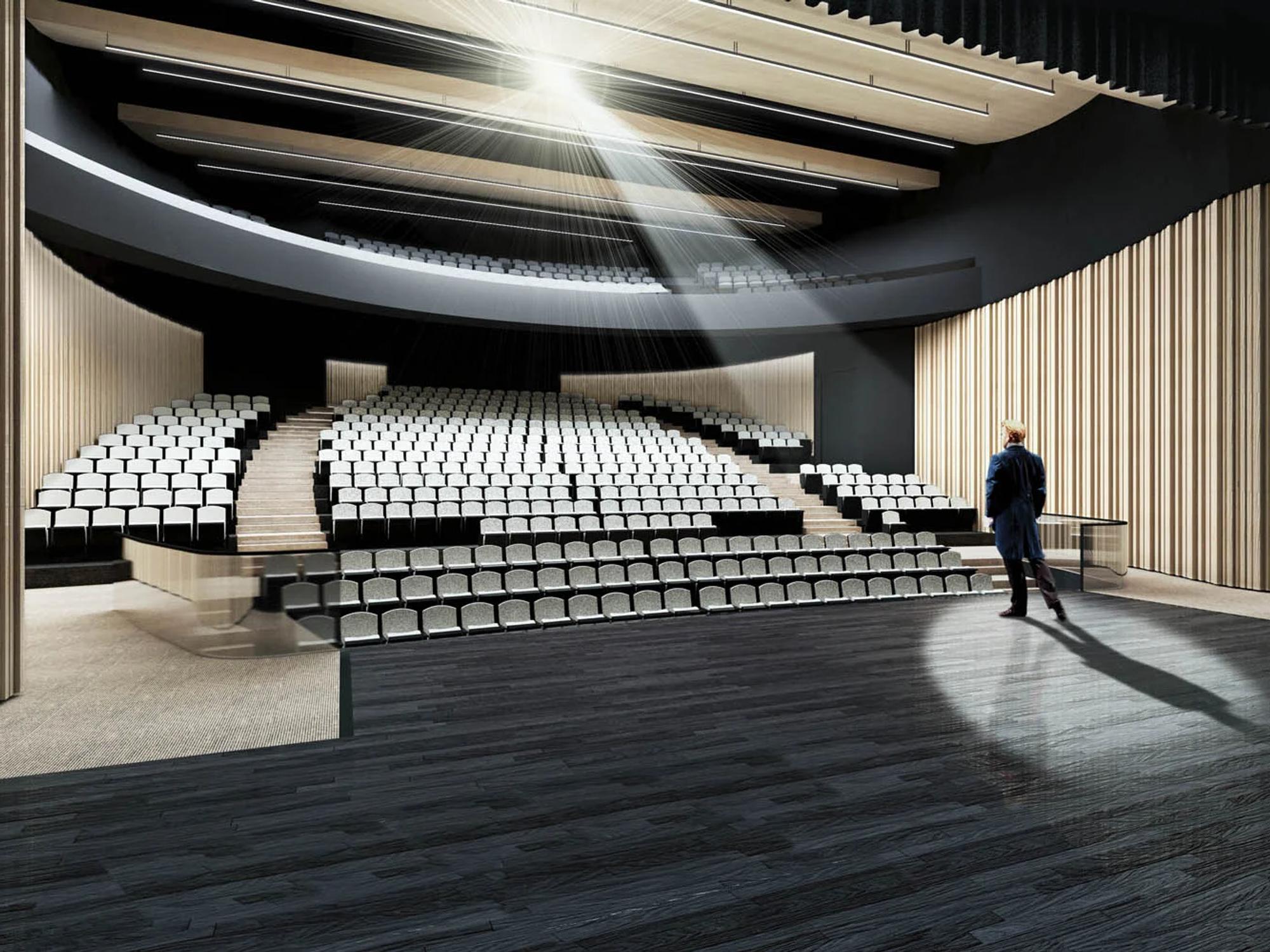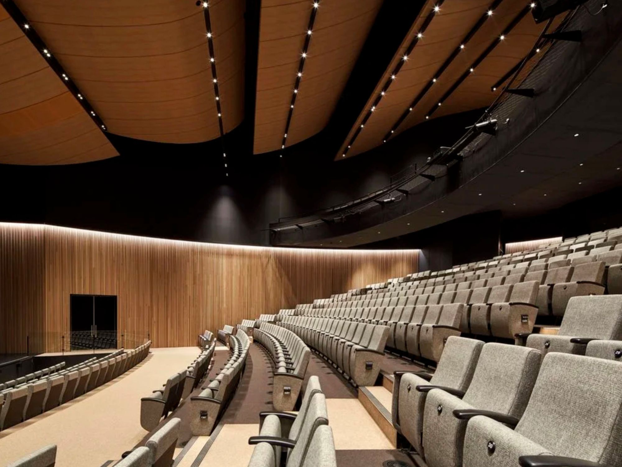 Technical performance was central to the design. High-level steel gantries, a dedicated orchestra pit, and carefully planned mechanical air distribution systems are integrated discreetly within the lower level and beneath the seating. Careful attention to sightlines, acoustics and material selection ensures the auditorium functions as well as it presents. Positioned prominently at the front of the campus, the drum-shaped building establishes a strong civic presence while delivering a refined, high-quality environment for performance and gathering.
