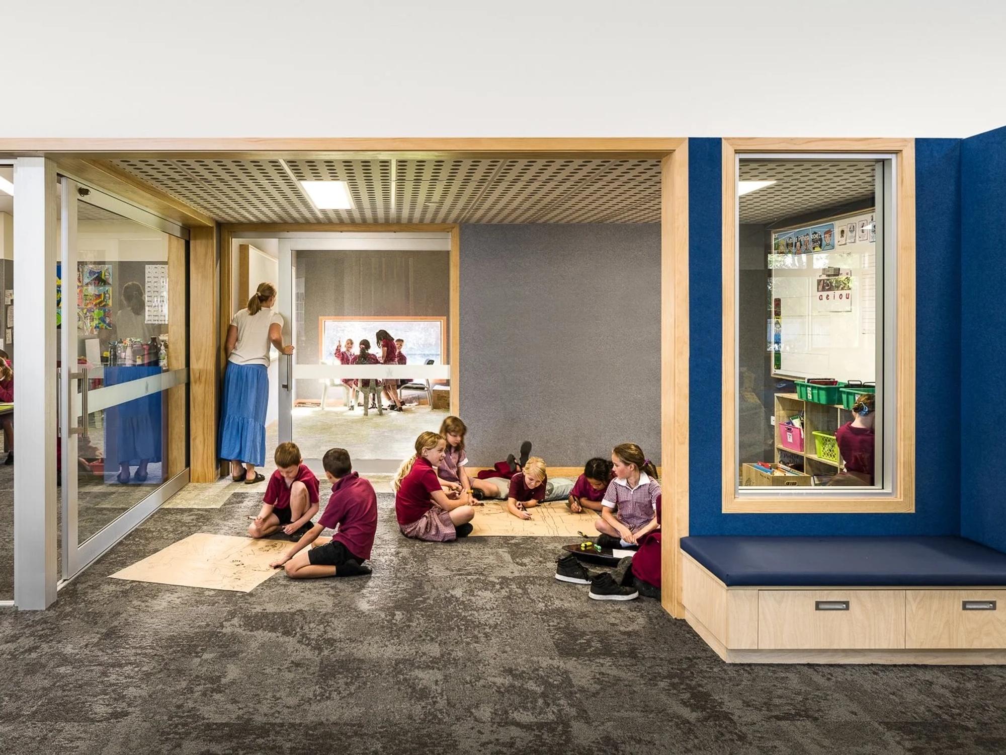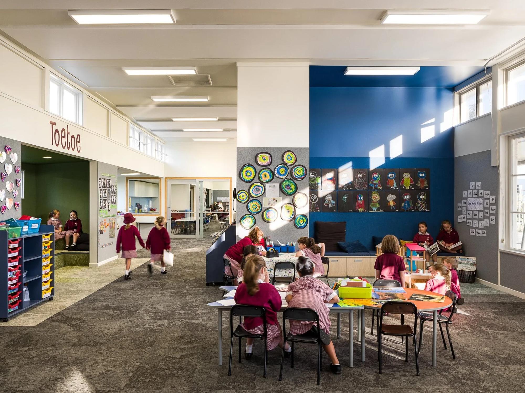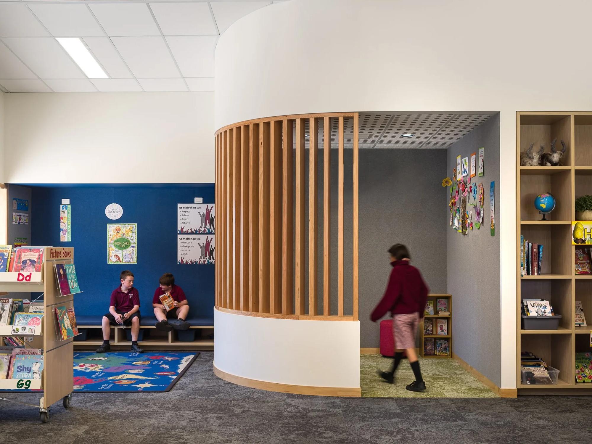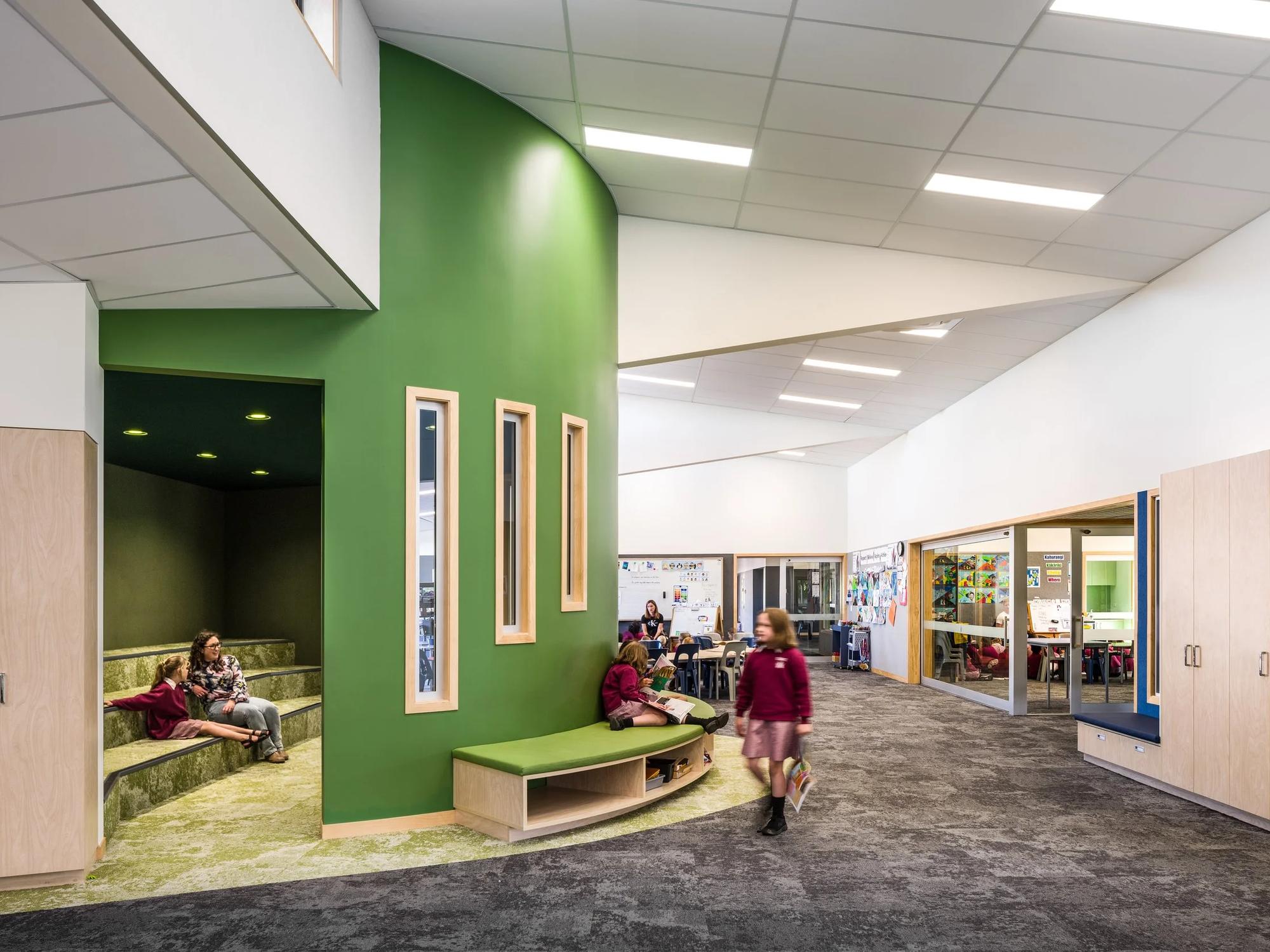 Research played an important role in guiding the design. Reducing Stress in Schools by Kathleen Liberty informed a considered approach to colour, highlighting its influence on wellbeing and concentration. In response, a restrained palette of blues, greens, soft greys and natural timber tones was introduced throughout the learning spaces. The staged build, delivered over two and a half years, combined refurbishment and new construction, carefully balancing continuity with change.