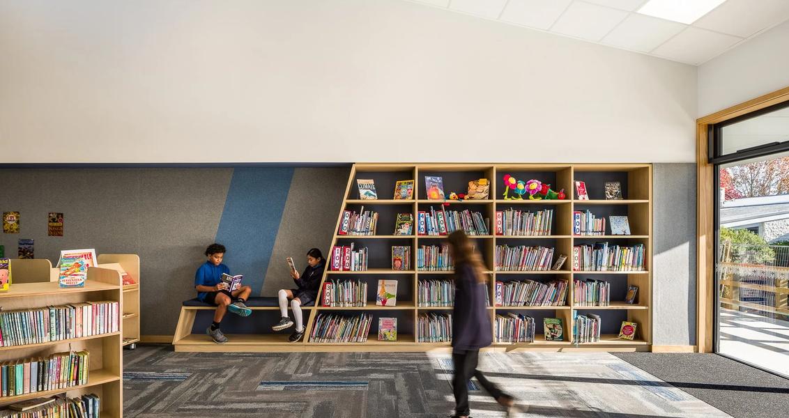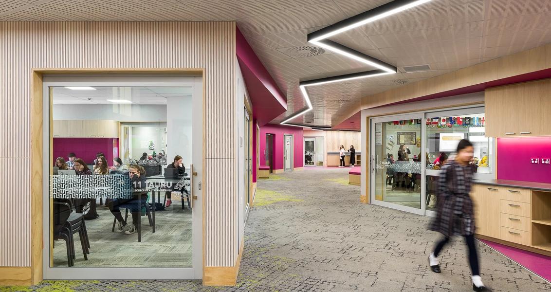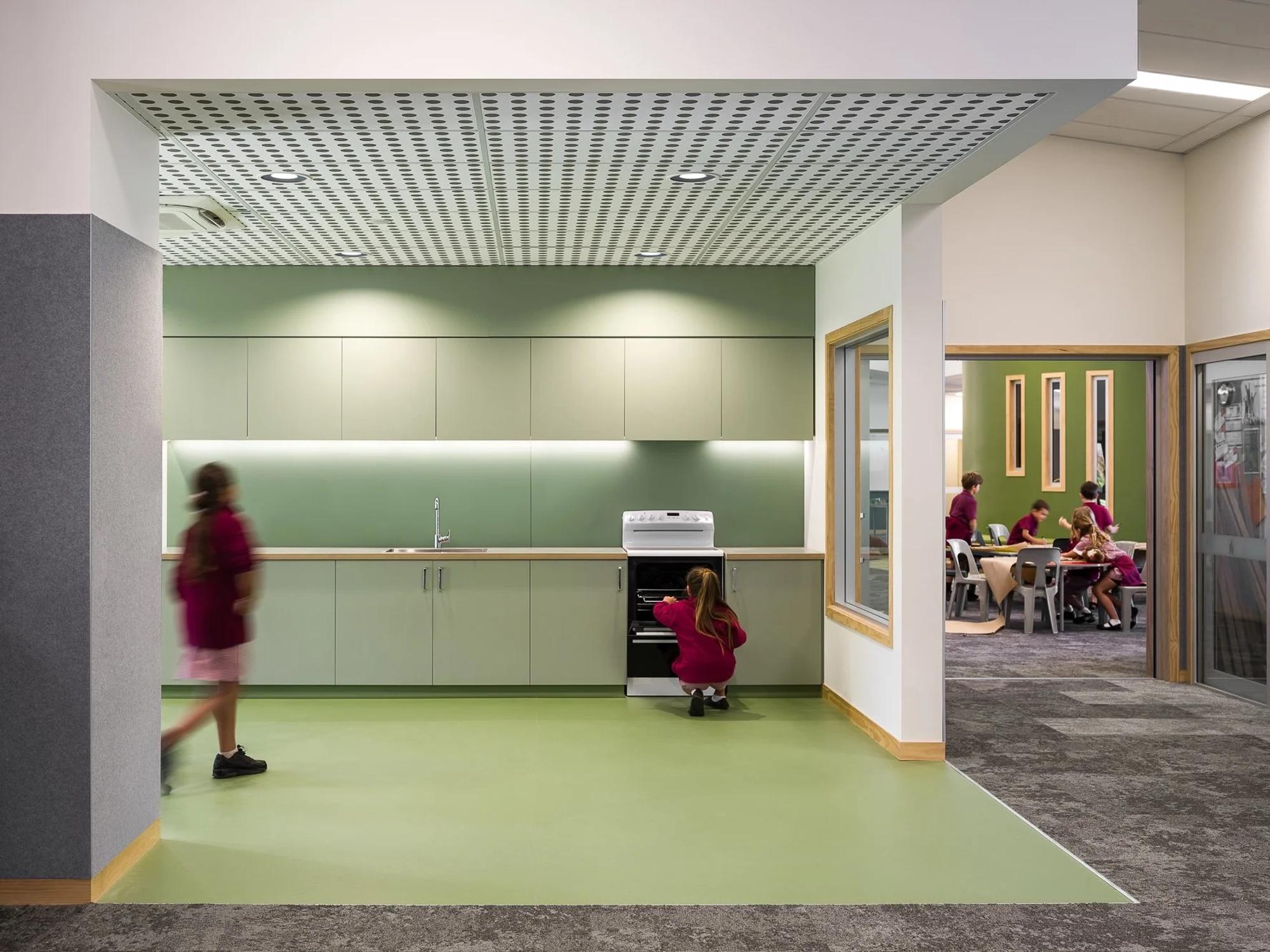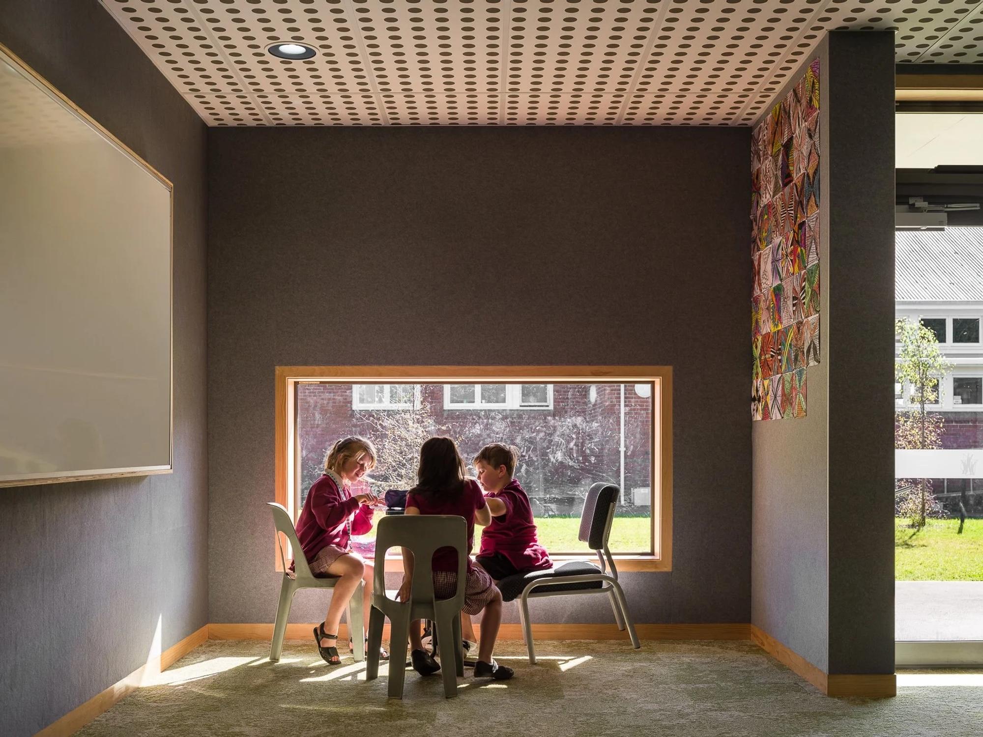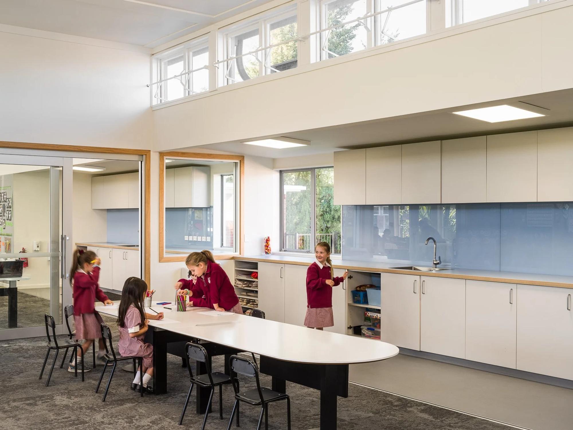 Research played an important role in guiding the design. Reducing Stress in Schools by Kathleen Liberty informed a considered approach to colour, highlighting its influence on wellbeing and concentration. In response, a restrained palette of blues, greens, soft greys and natural timber tones was introduced throughout the learning spaces. The staged build, delivered over two and a half years, combined refurbishment and new construction, carefully balancing continuity with change.