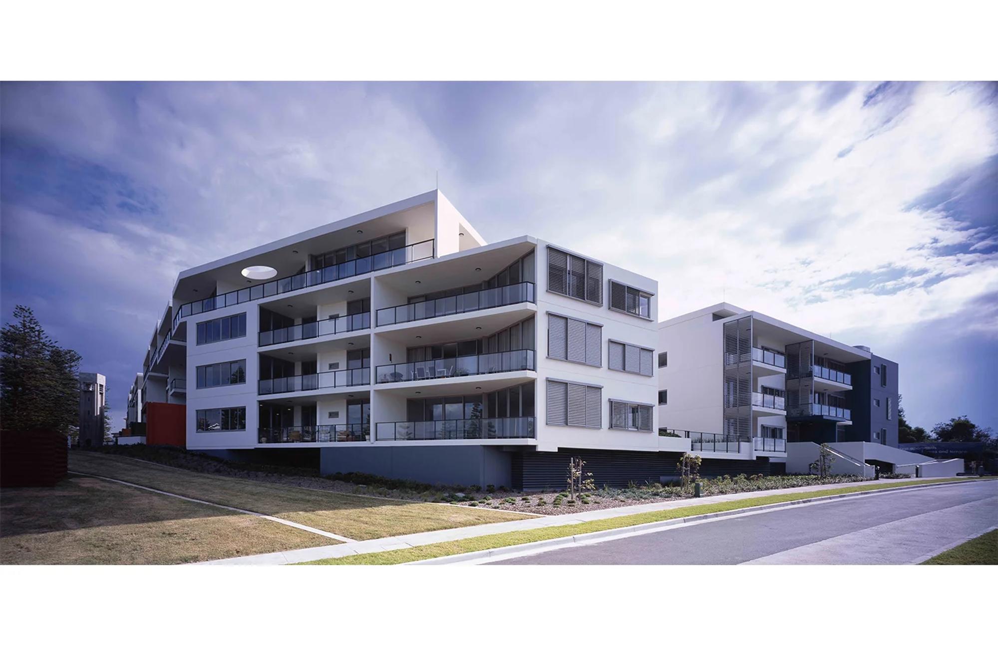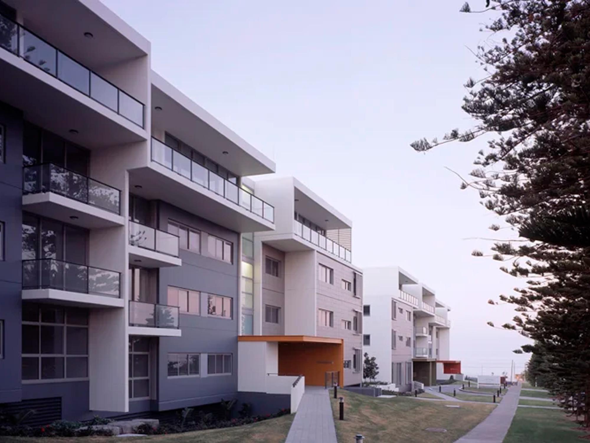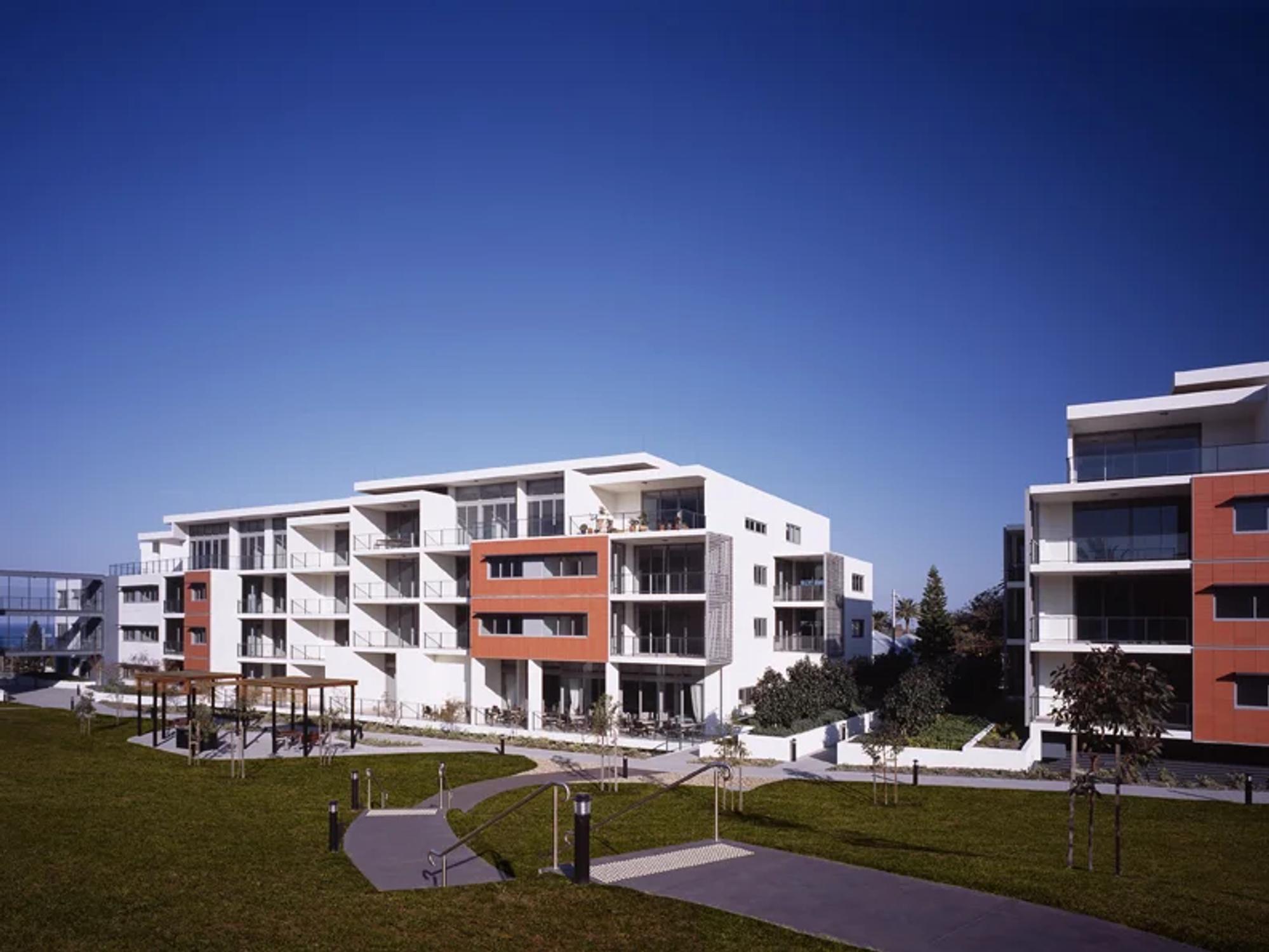 Across the coastal site, a series of low-rise apartment buildings respond to ocean views, landscaped courtyards and direct beach access. One elevated four-storey building provides 45 one-, two- and three-bedroom independent living units above basement parking, its white façade articulated with varied terrace forms to moderate scale and reinforce a residential character. Additional three- and four-storey buildings accommodate a further 84 apartments, with built form broken into distinct elements to preserve view corridors and introduce sheltered communal gardens. Convivial shared living and dining areas, supported by 24-hour concierge services, foster both independence and security.