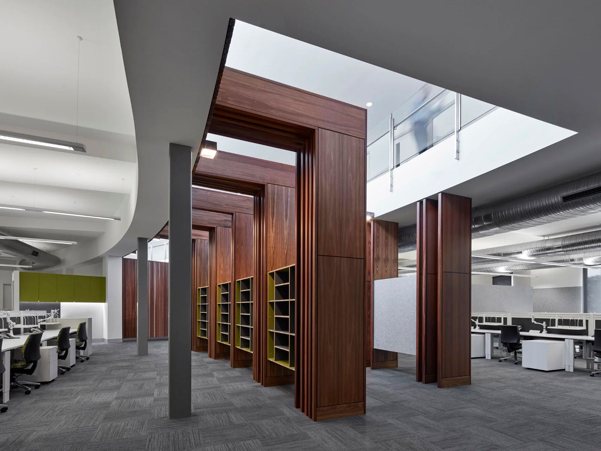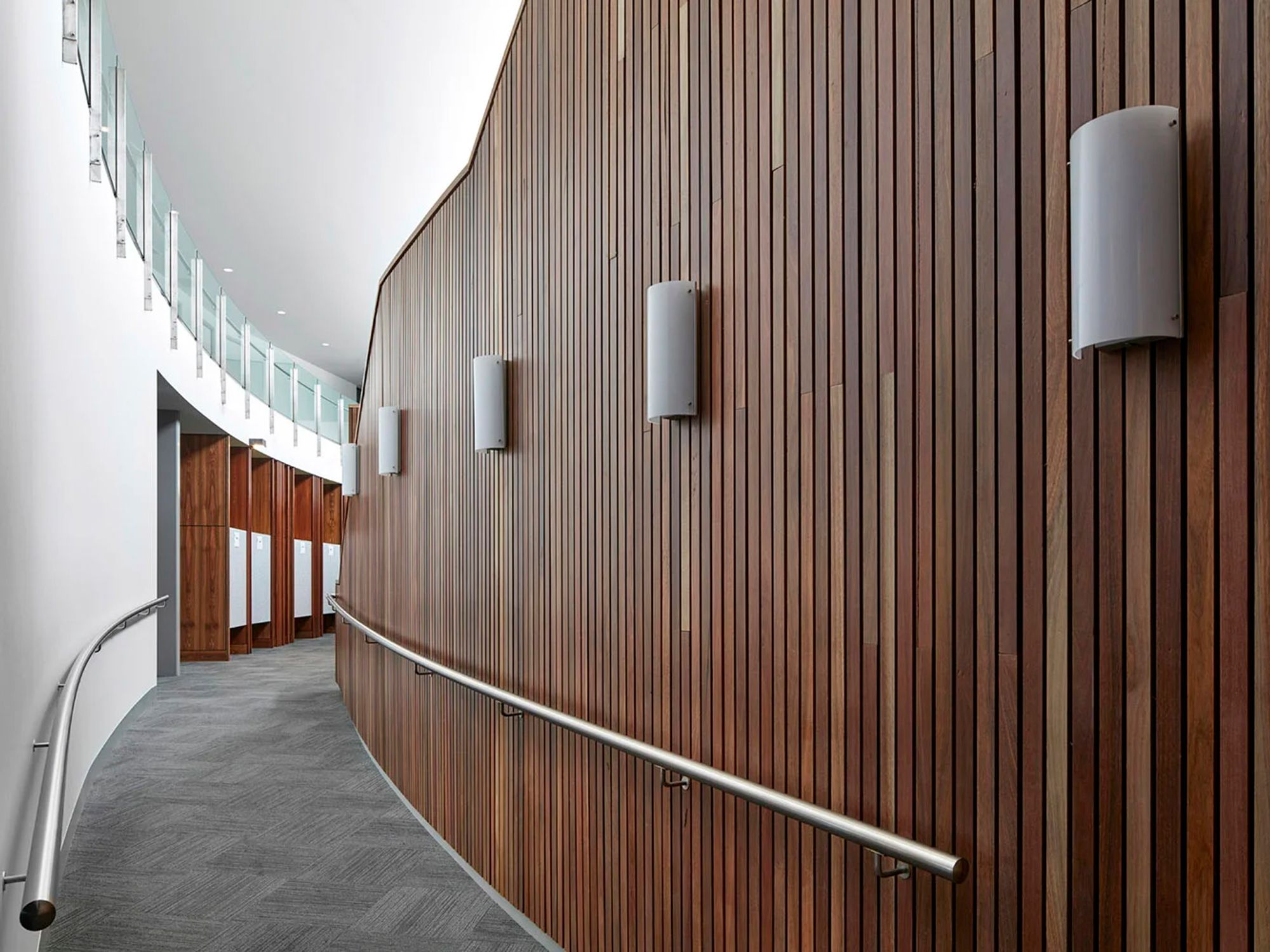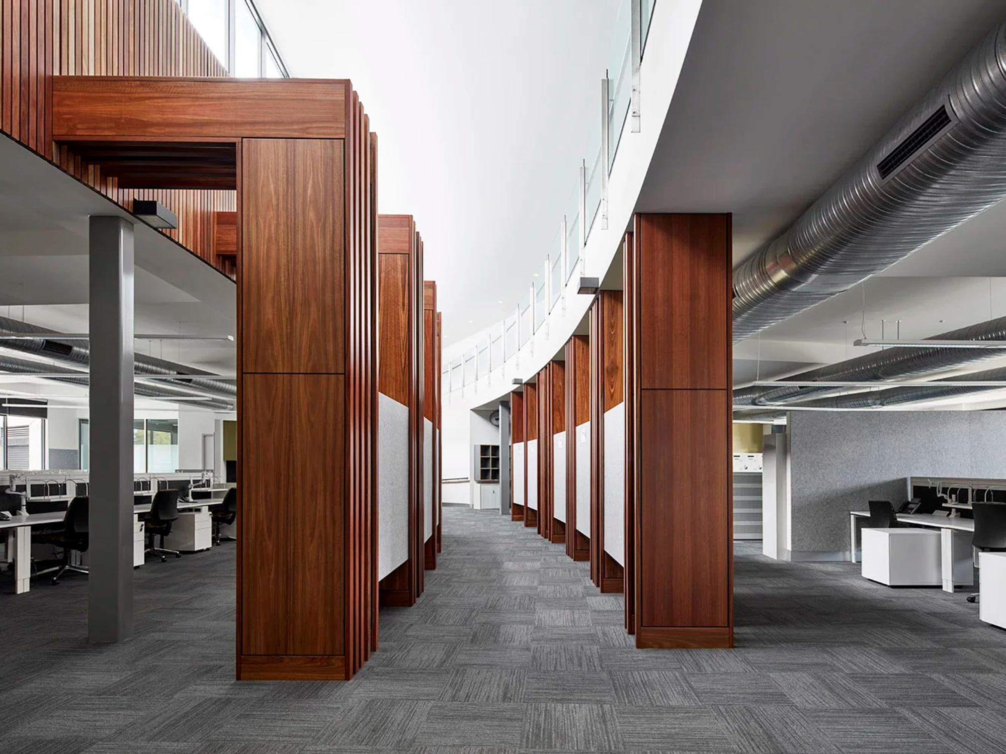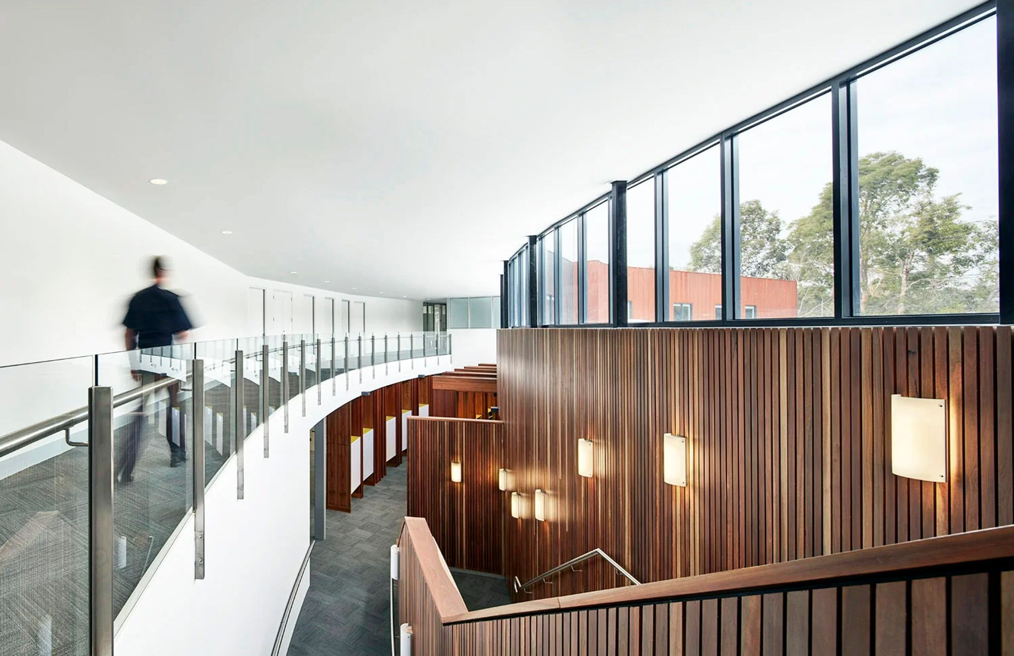 Internally, the connection to the environment continues through timber panelling and a neutral, textural palette. Large windows provide tree-top views and bring natural light deep into offices, creating a workspace that is both secure and inviting. The overall design balances civic presence, operational functionality and sensitivity to the surrounding landscape, delivering a facility that serves both the police and the community.