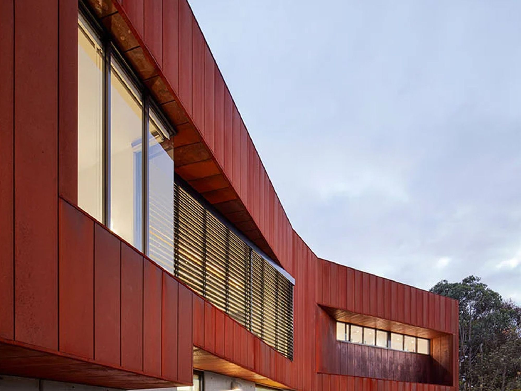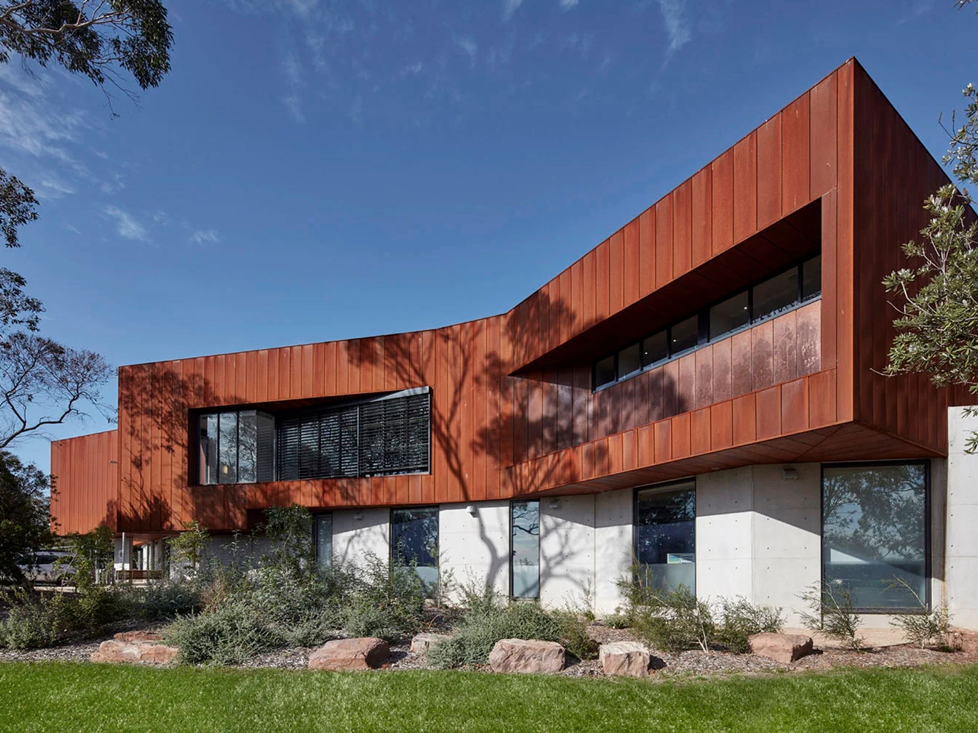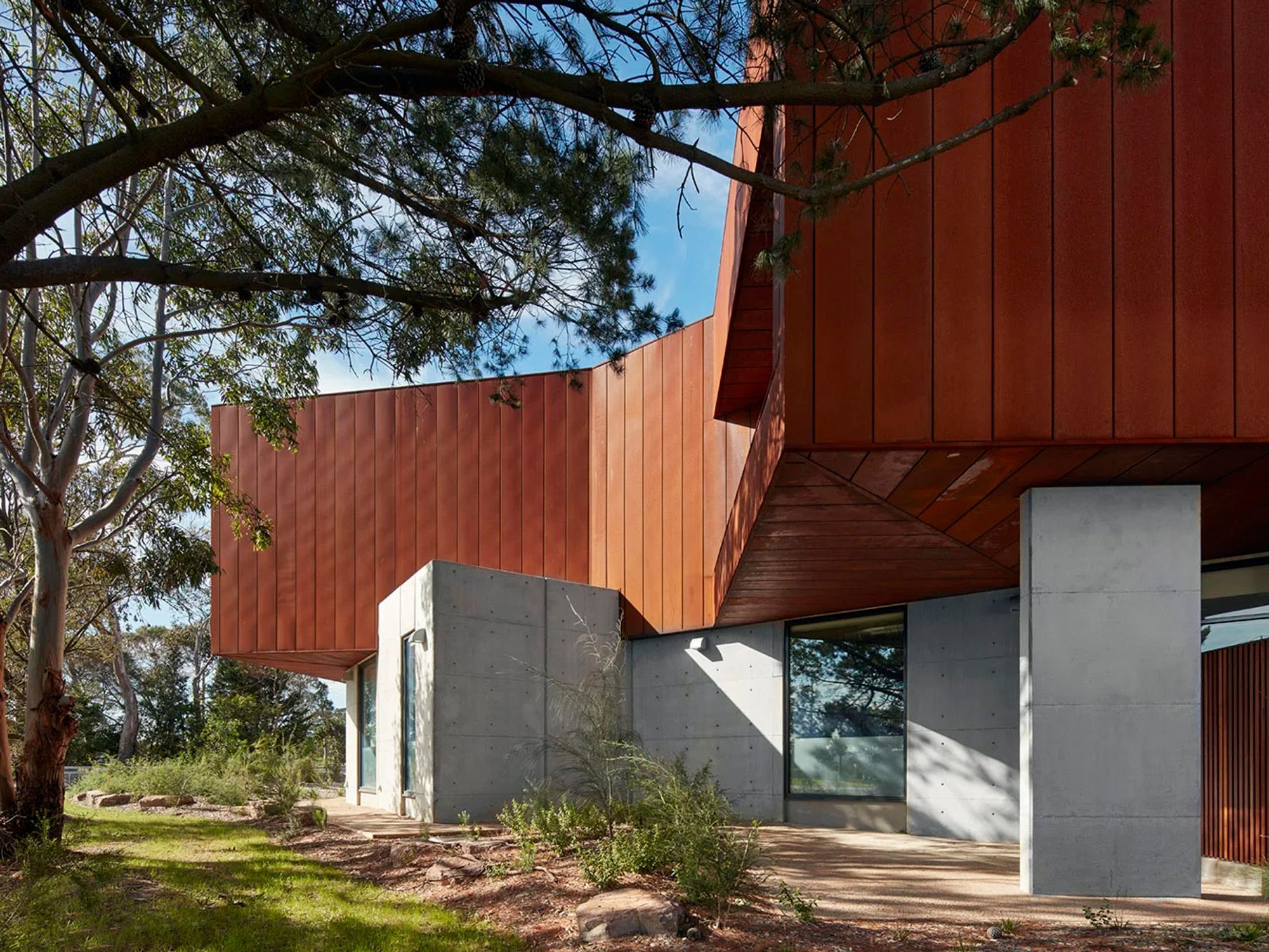 The building follows the natural contours of the site, conserving existing trees and integrating seamlessly with its residential surroundings. A ground-hugging precast concrete base conveys permanence and protection, while the upper level features folded Corten steel cladding shaped into a five-point star, referencing Victoria Police’s core values of integrity, leadership, flexibility, respect and professionalism. The warm tones of the cladding echo the local landscape, including fallen leaves and pinecones.