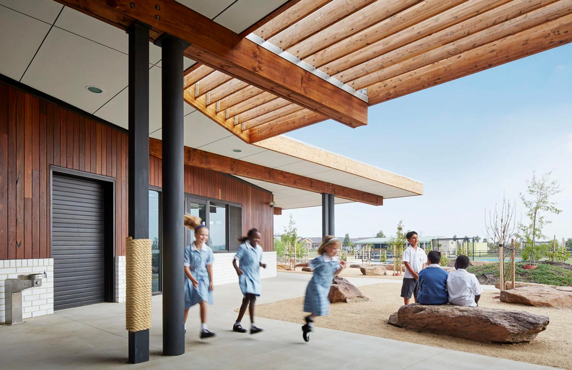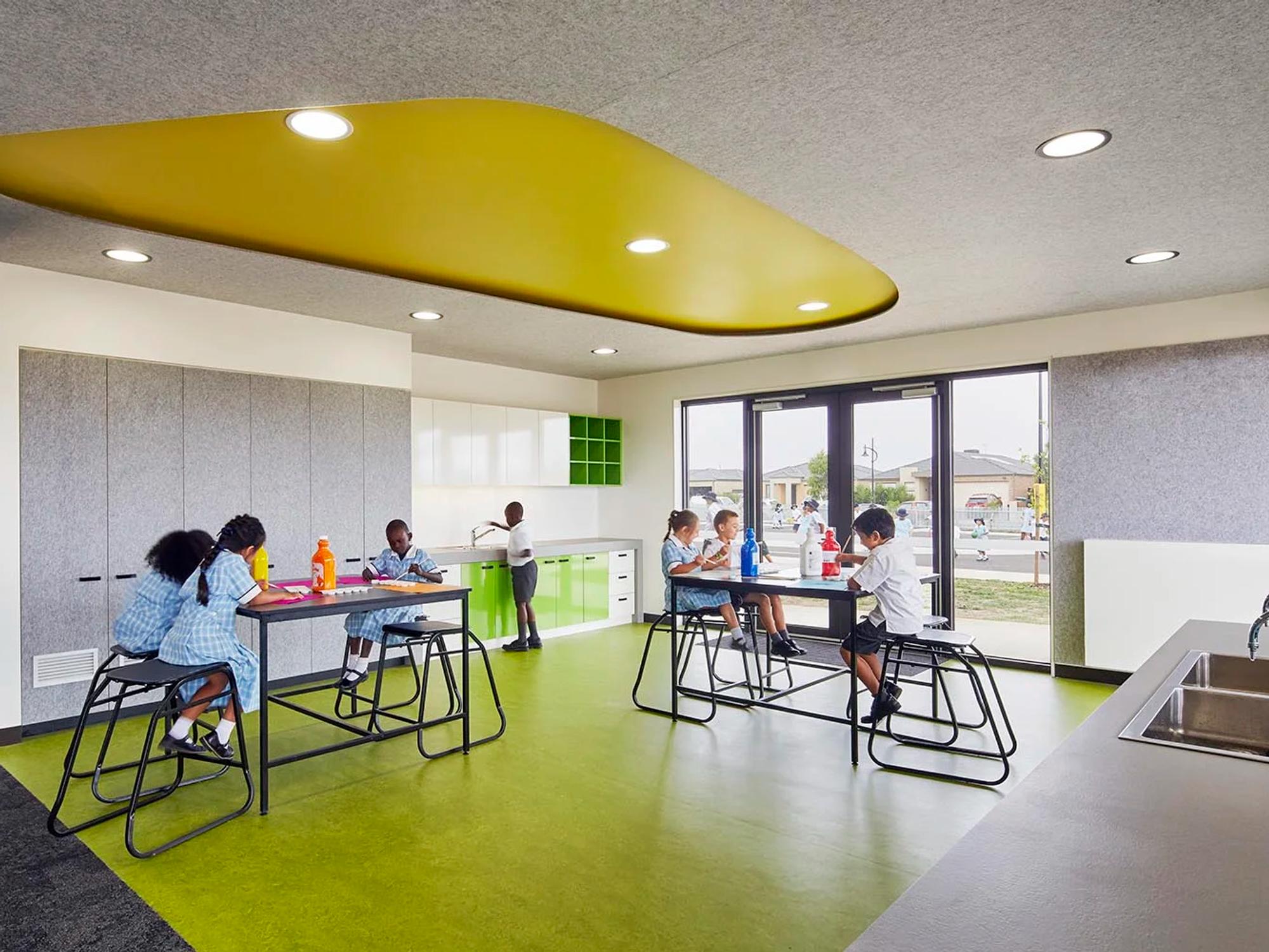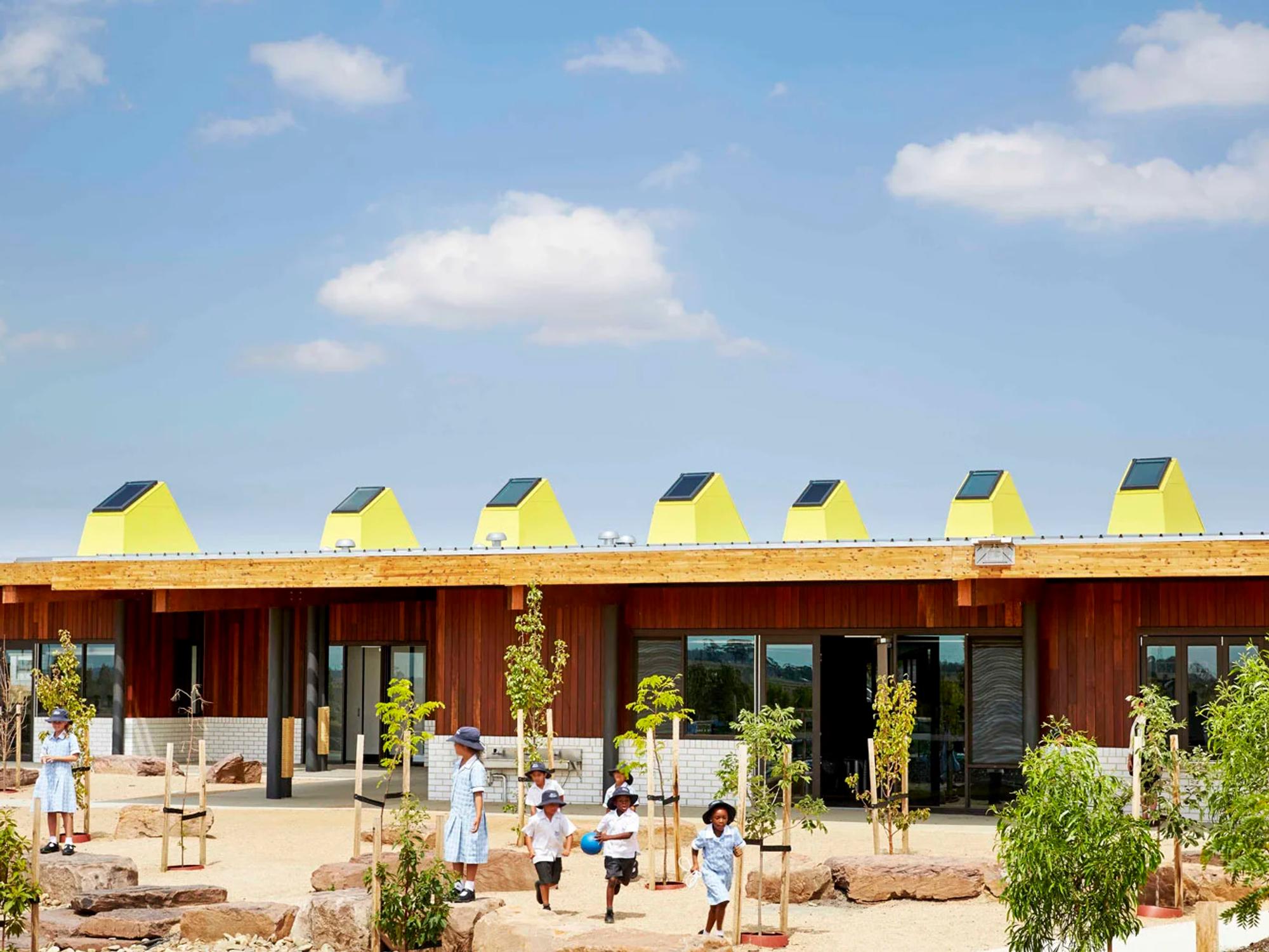 Sustainability is a key focus of the design. Features include a thermally efficient building fabric, ample natural light and ventilation, hydronic heating, a night purge system for summer cooling, solar panels, LED lighting, and rainwater collection for toilet flushing and irrigation. The landscape also incorporates swales and provision for future vegetable gardens, supporting hands-on learning and environmental awareness.