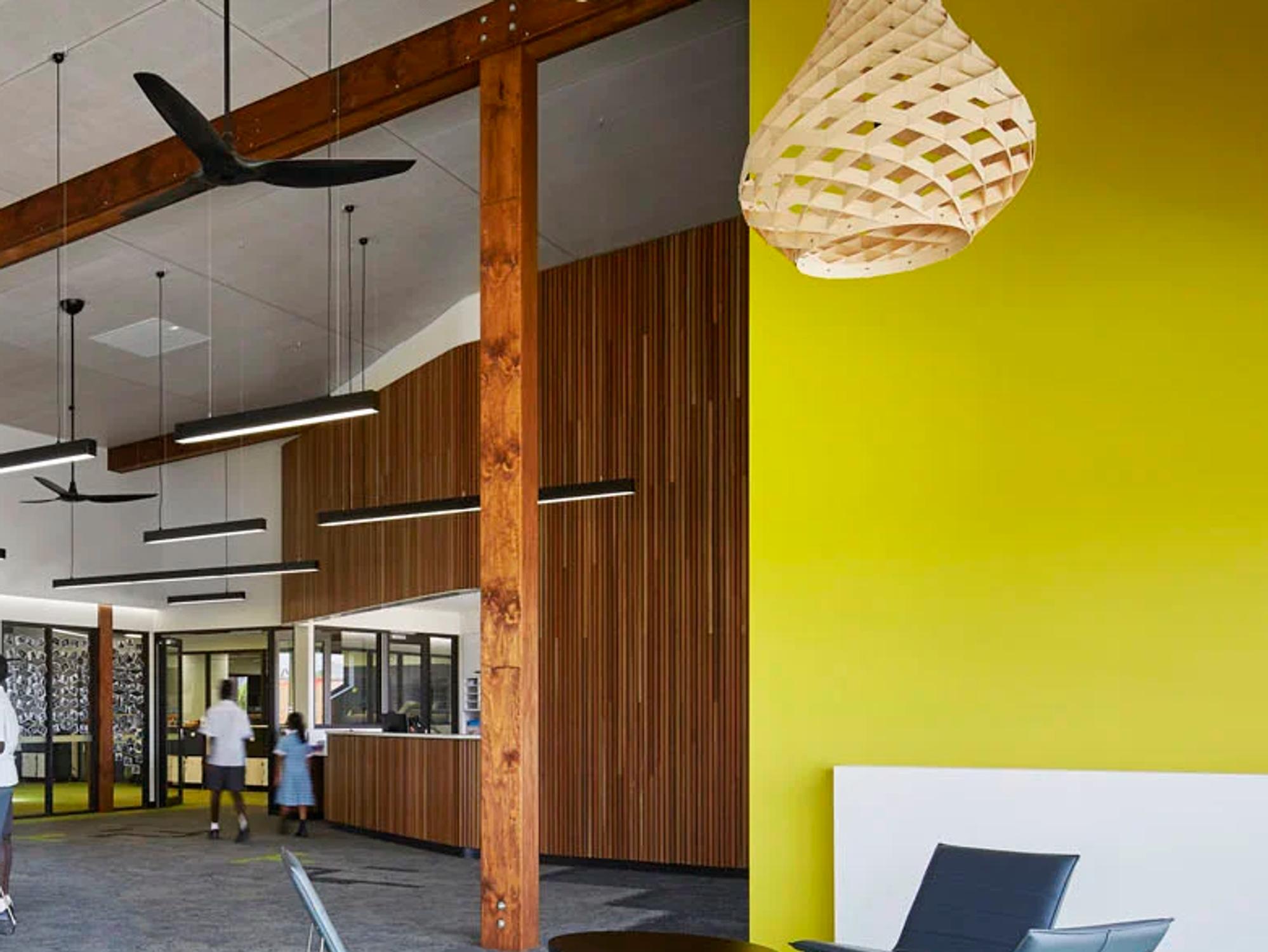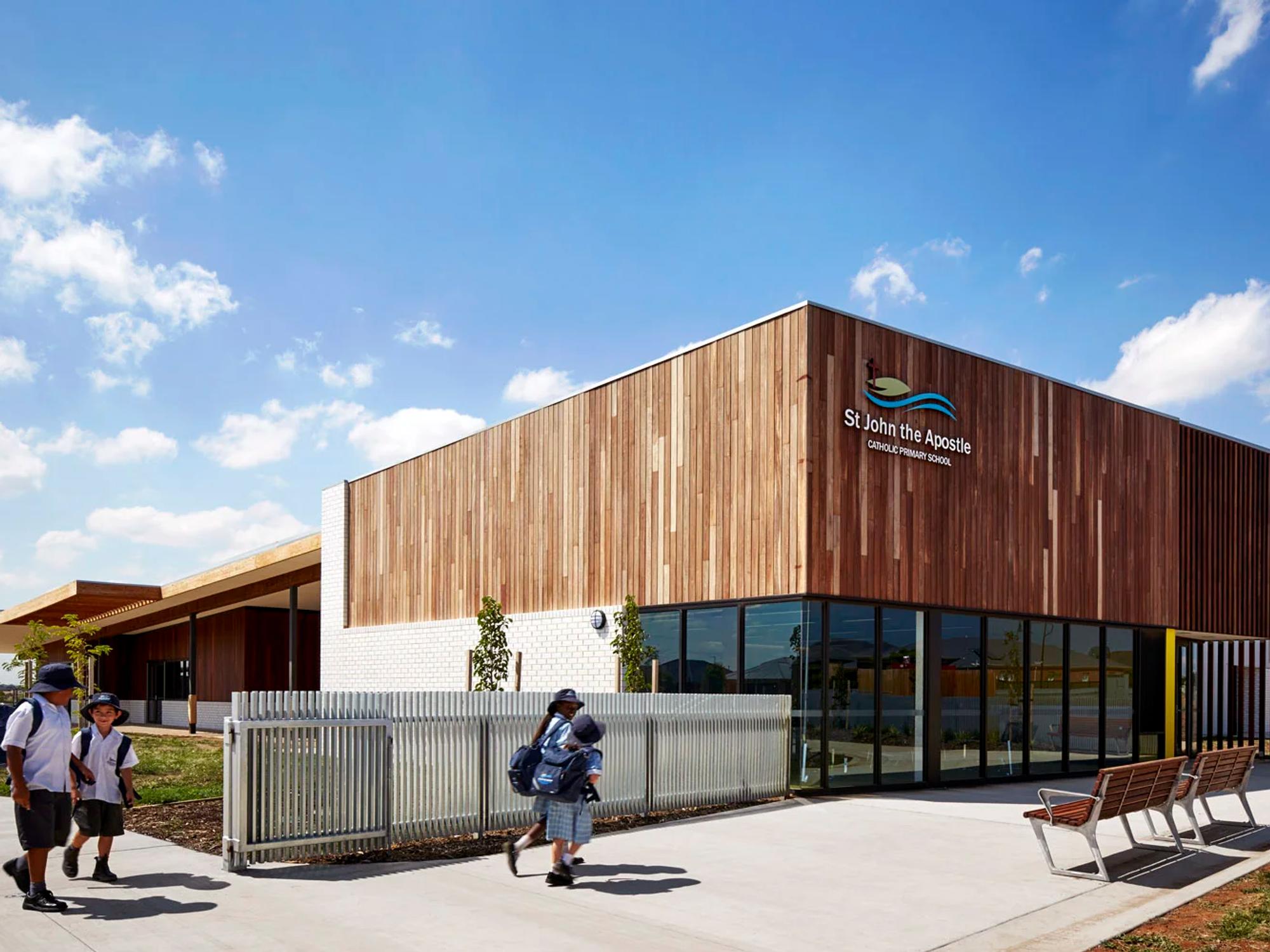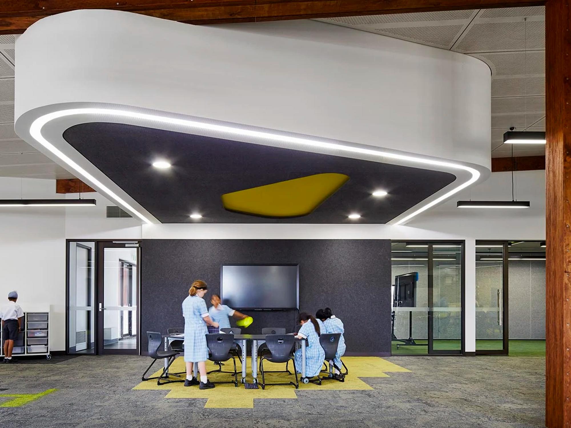 Sustainability is a key focus of the design. Features include a thermally efficient building fabric, ample natural light and ventilation, hydronic heating, a night purge system for summer cooling, solar panels, LED lighting, and rainwater collection for toilet flushing and irrigation. The landscape also incorporates swales and provision for future vegetable gardens, supporting hands-on learning and environmental awareness.
