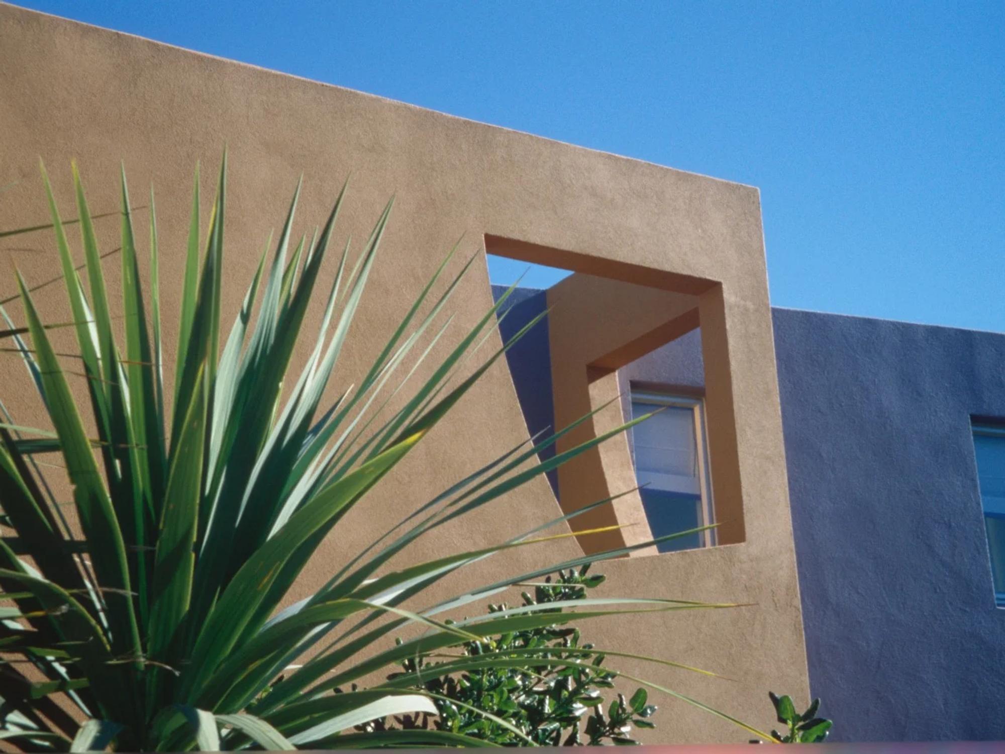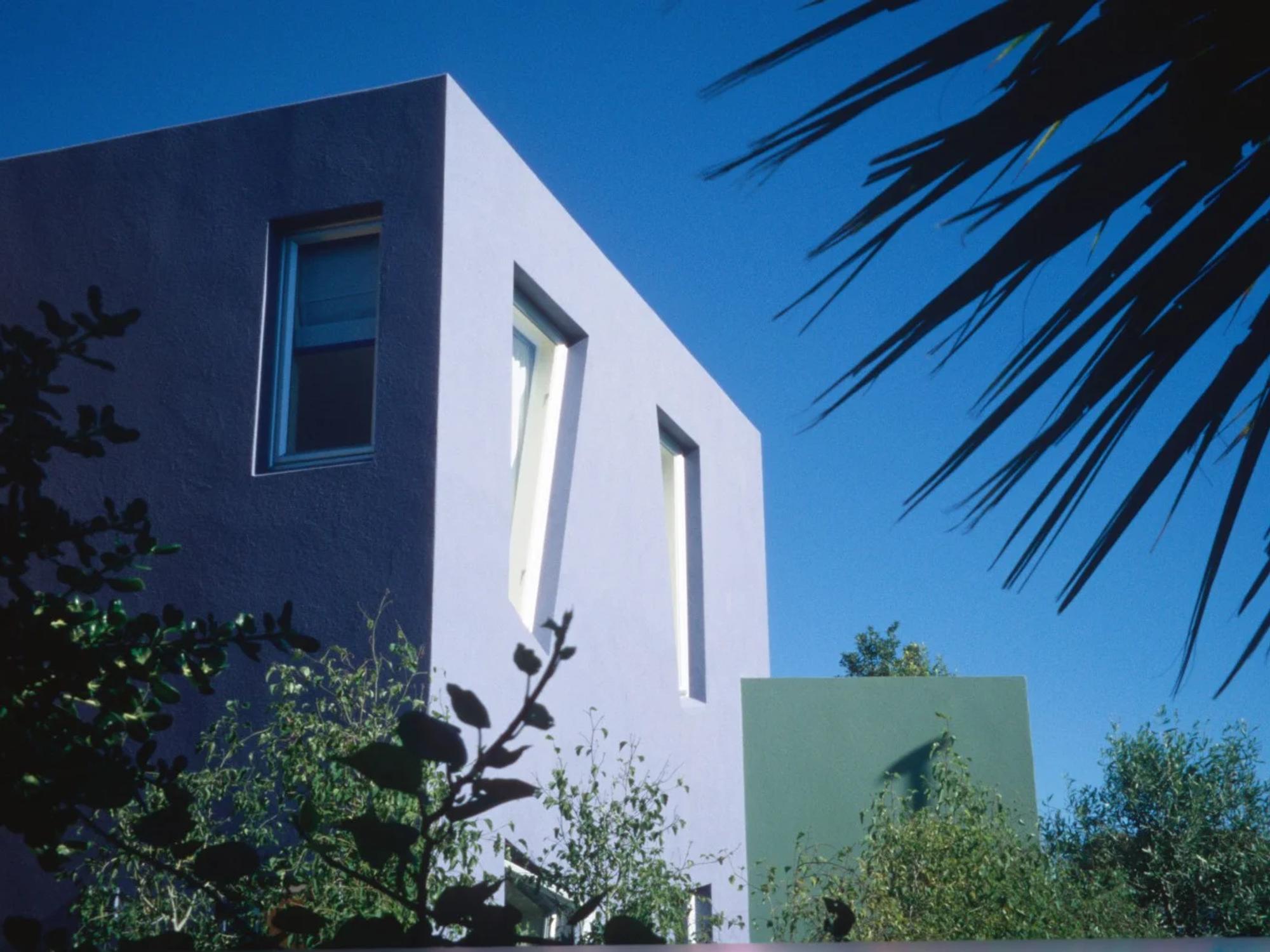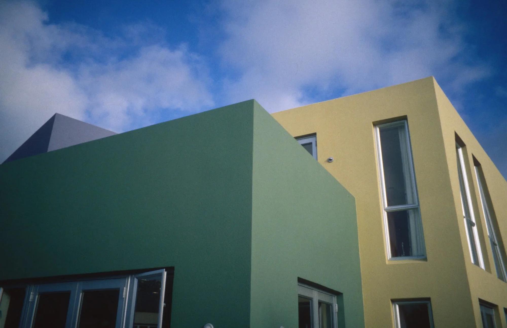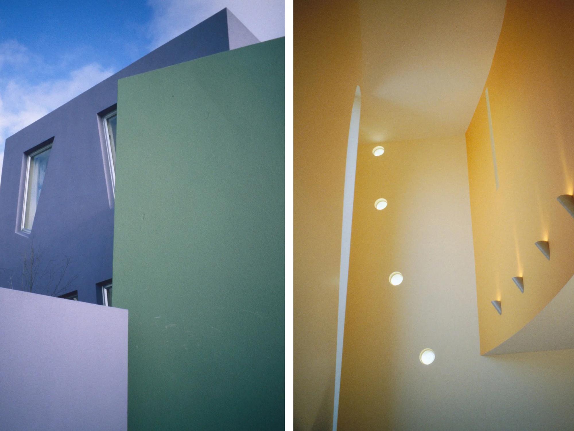 Externally, the house becomes a playful collage of sculptural forms and vibrant surfaces. Thick monolithic walls, deep-set openings and recessed windows create rhythm and contrast, with shaped apertures expressing the character of the interior to the street. Each elevation reads differently — a reflection of the dynamic spaces within — reinforcing the home’s identity as an architectural composition shaped by colour, geometry and imagination.