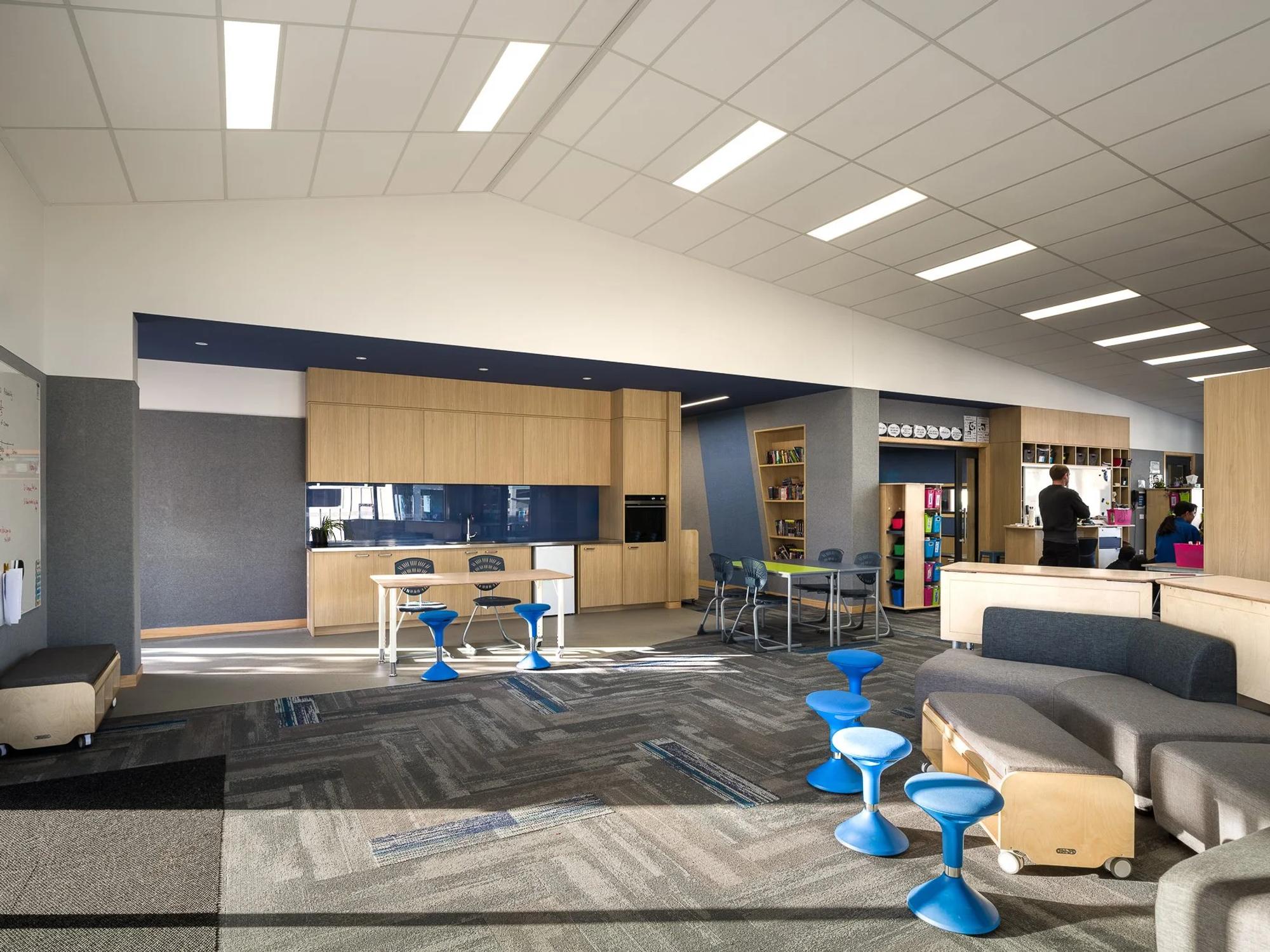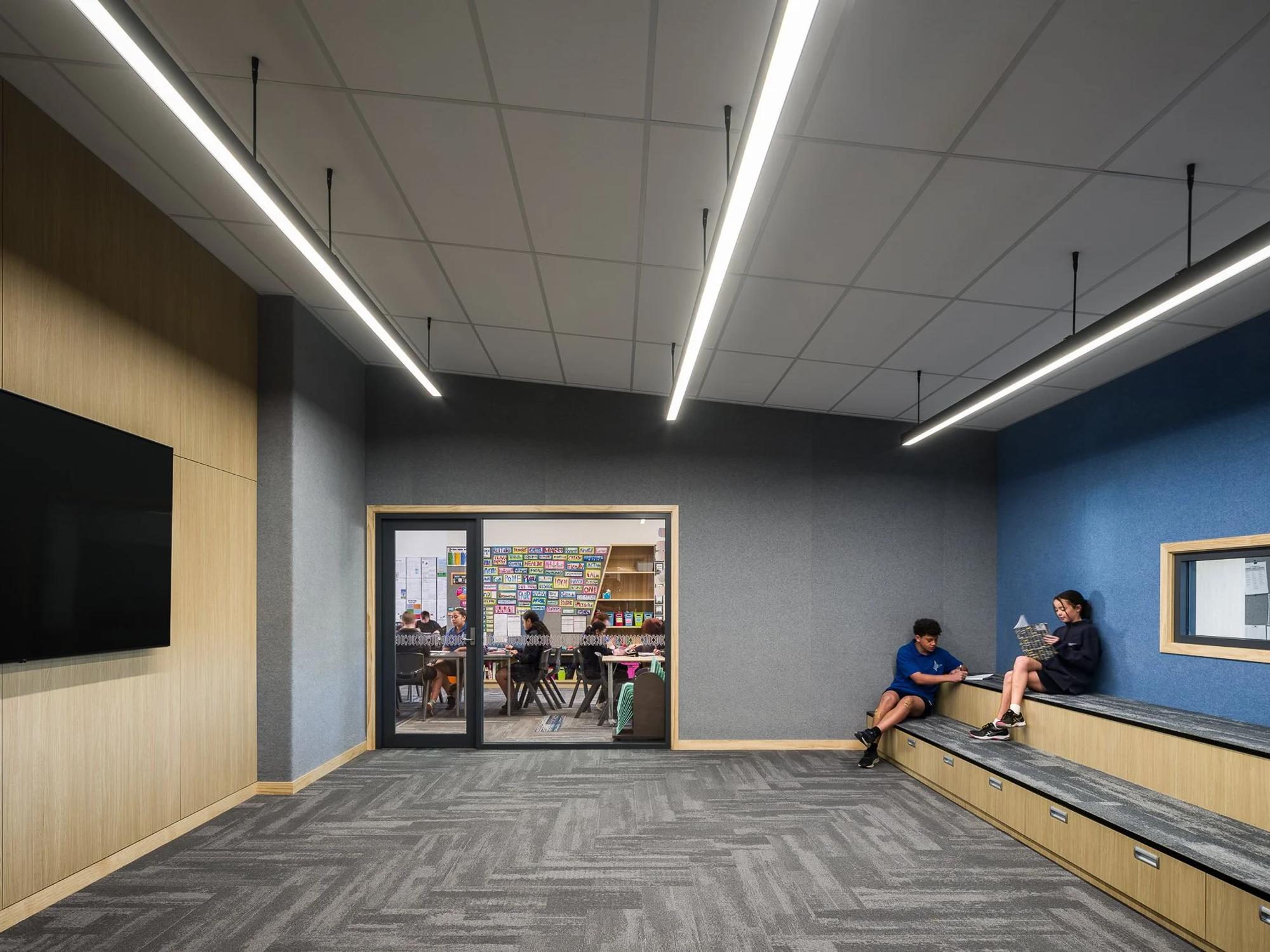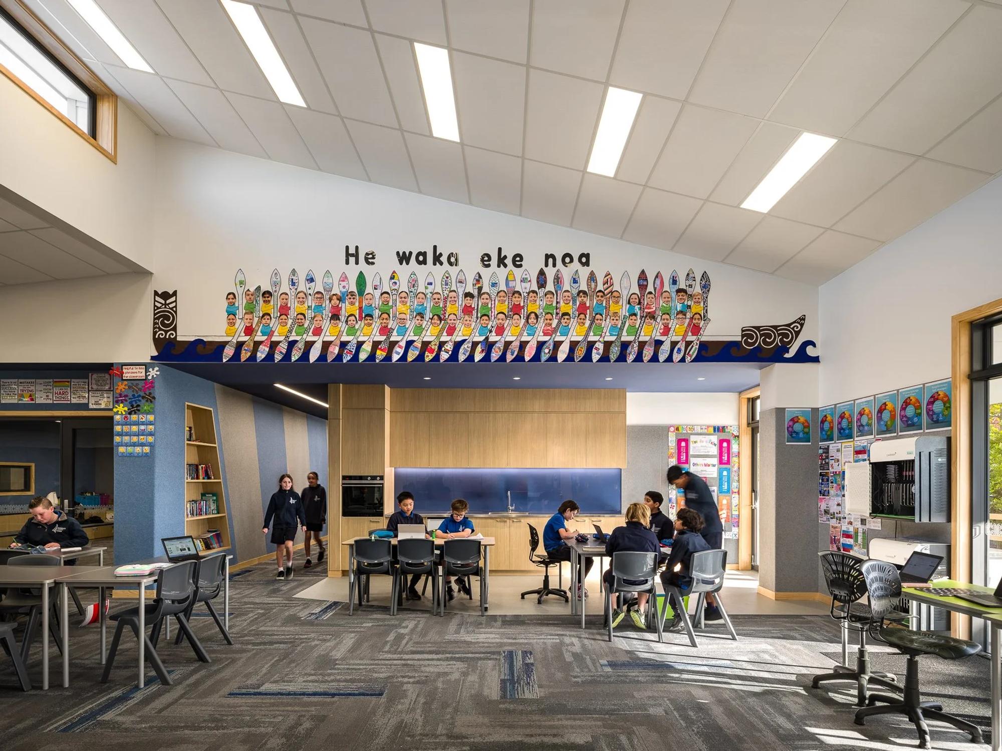 Arranged around a three-sided, north-facing courtyard, the new buildings reinforce the connection between indoor and outdoor environments. Landscaping has been carefully designed to provide accessible outdoor learning spaces, play areas, and gathering points for the whole school. Flexible, light-filled interiors with natural ventilation and high-quality acoustics support collaborative and adaptable learning. Each teaching space links seamlessly to wet areas, breakout zones, and outdoor environments, enabling multi-purpose use and ensuring that ākonga (students) can engage with learning in diverse, connected ways.